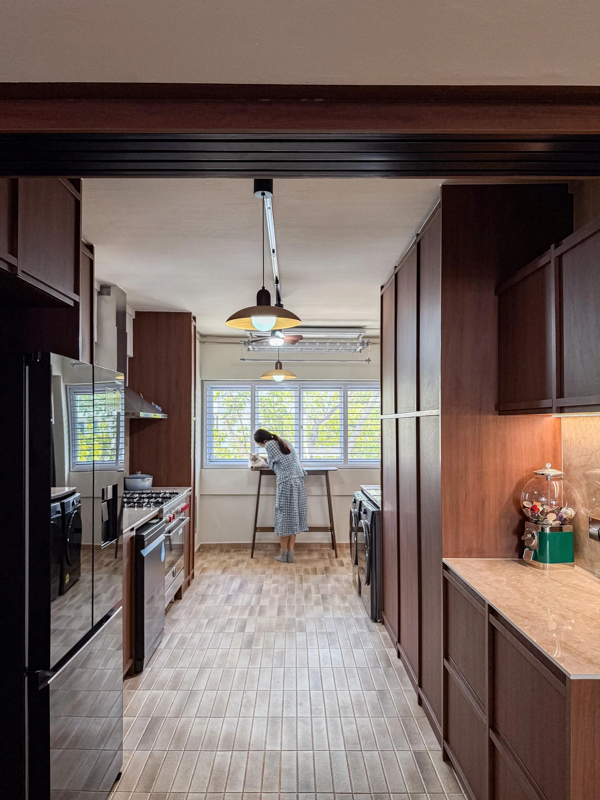 A warm, sculptural interior crafted with custom woodwork, soft curves, and seamless storage at Pasir Ris Dr 10.