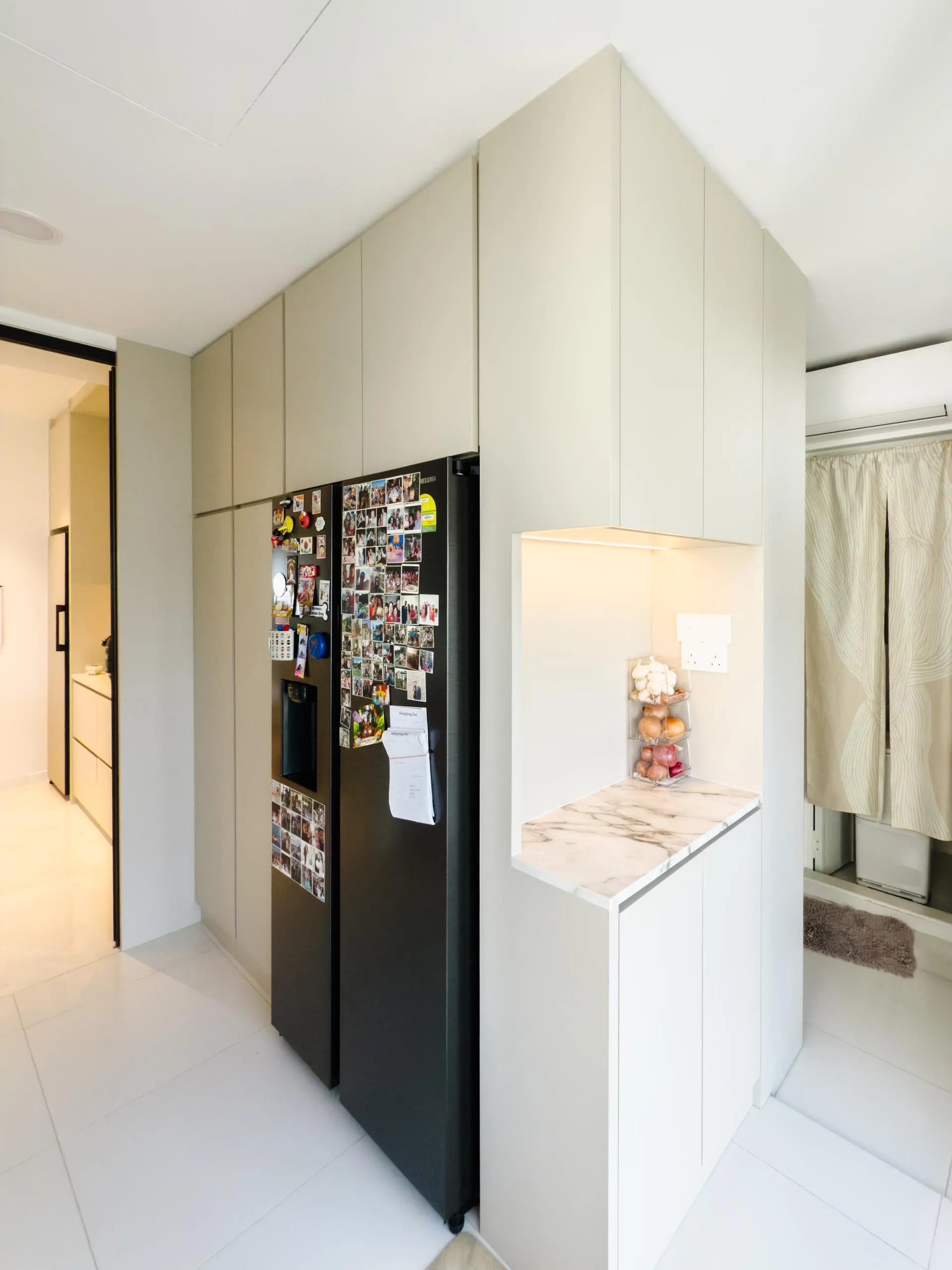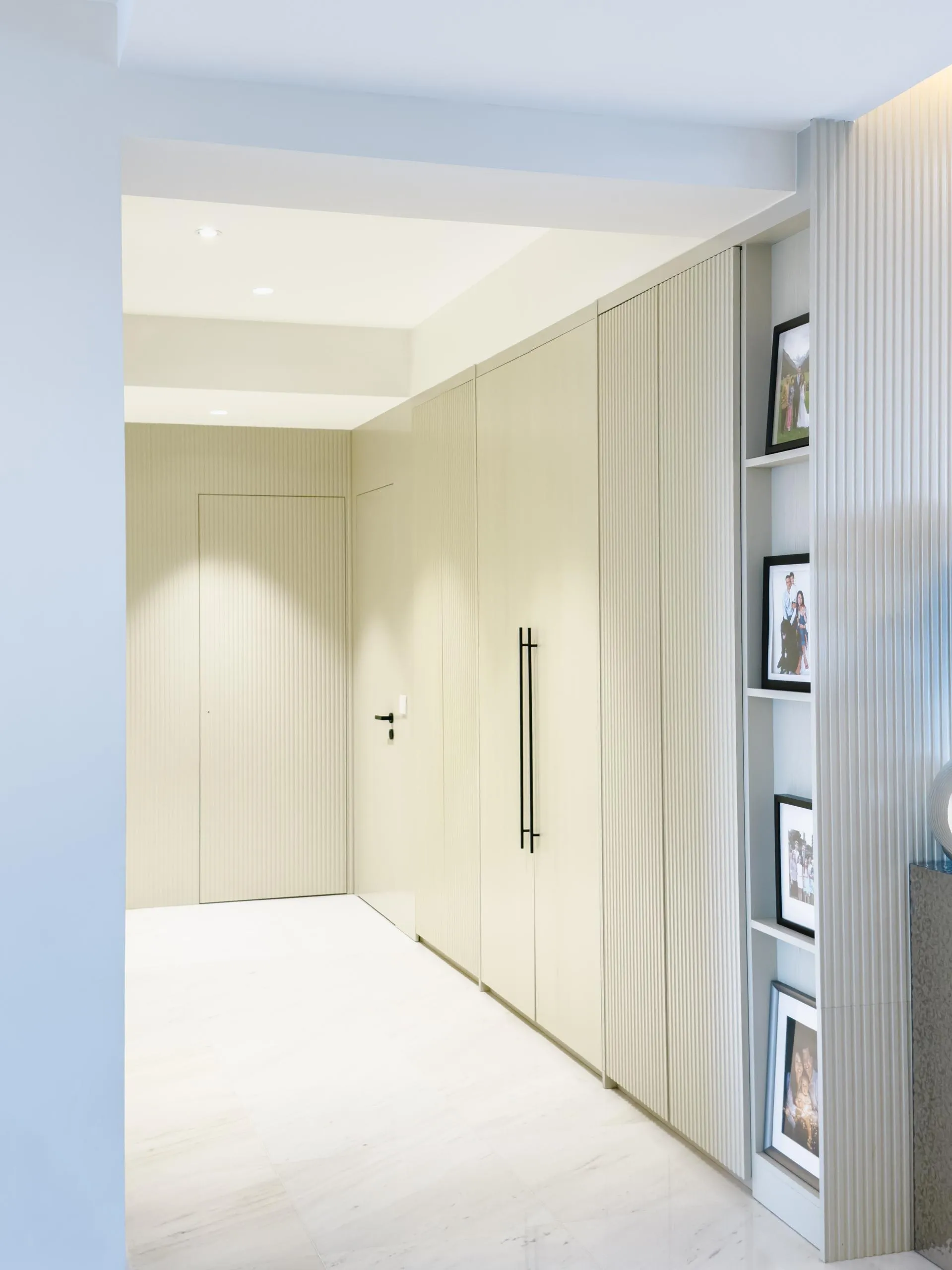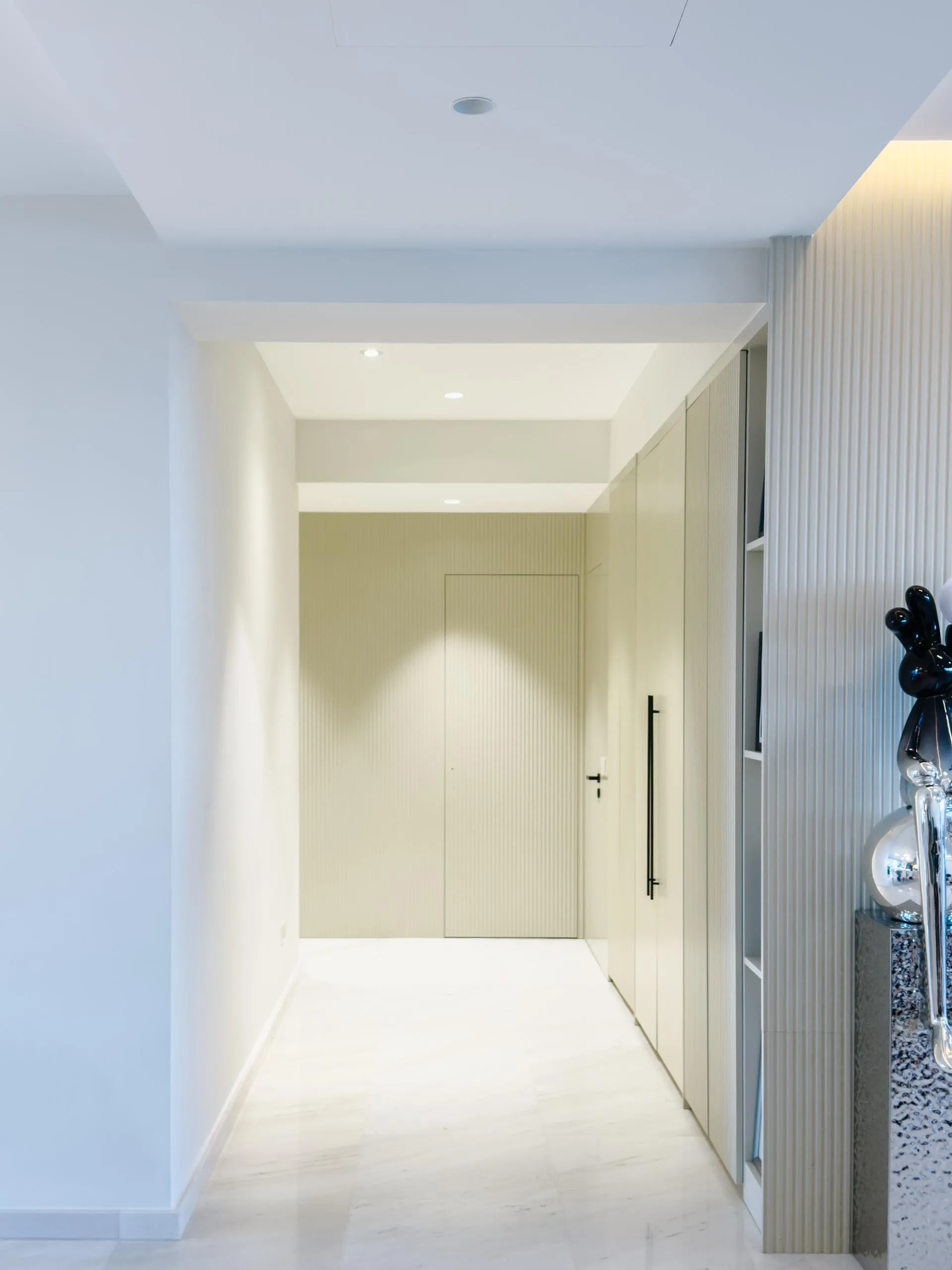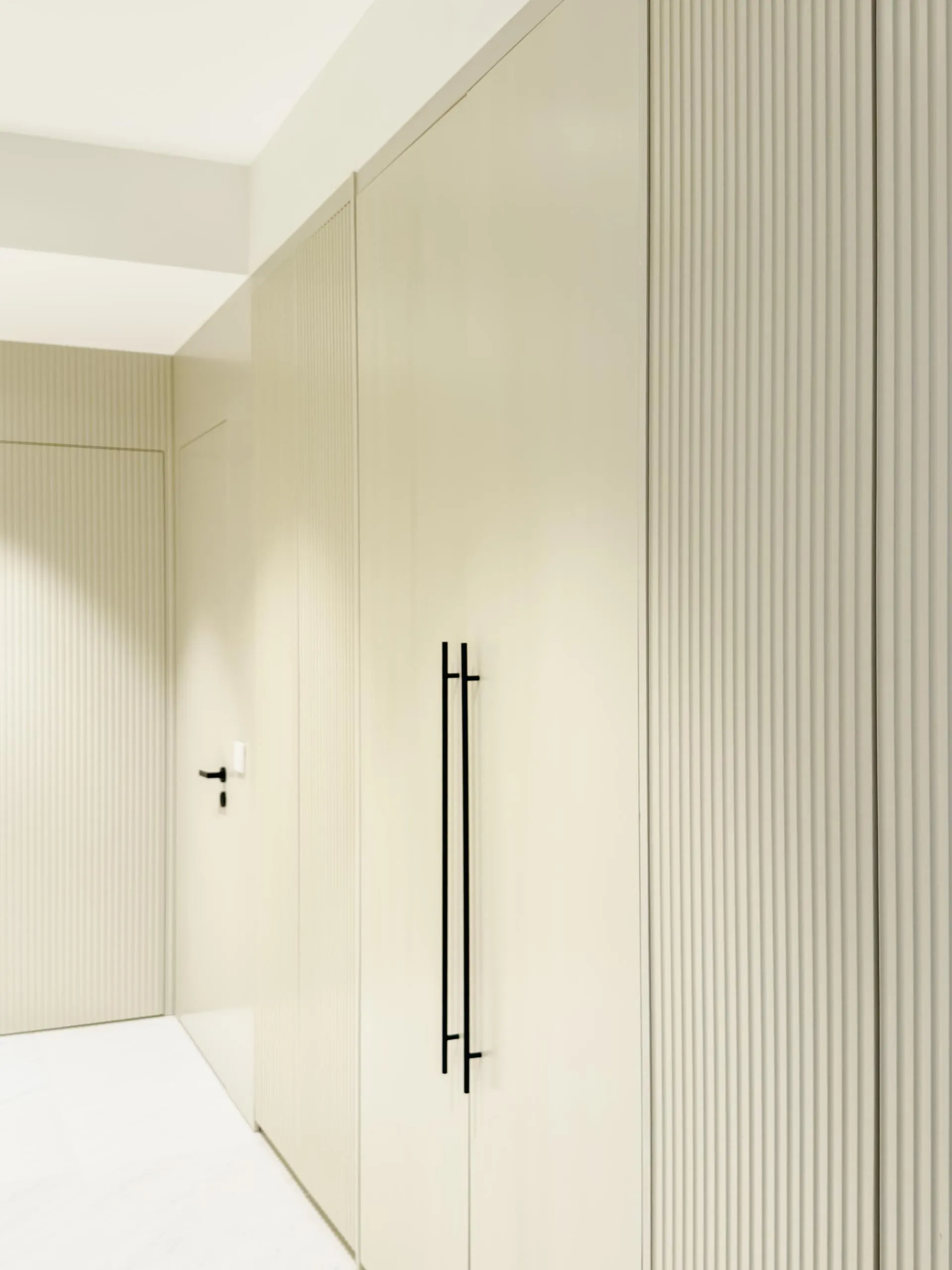 The design leans into soft minimalism, where architectural lines are clean, but never sterile. Fluted wall panels stretch across the hallway, visually elongating the space while concealing doorways with elegant subtlety. In the wet kitchen, matte laminate cabinetry in a soft beige tone blends seamlessly with the marble backsplash, creating a continuous, fluid visual language.