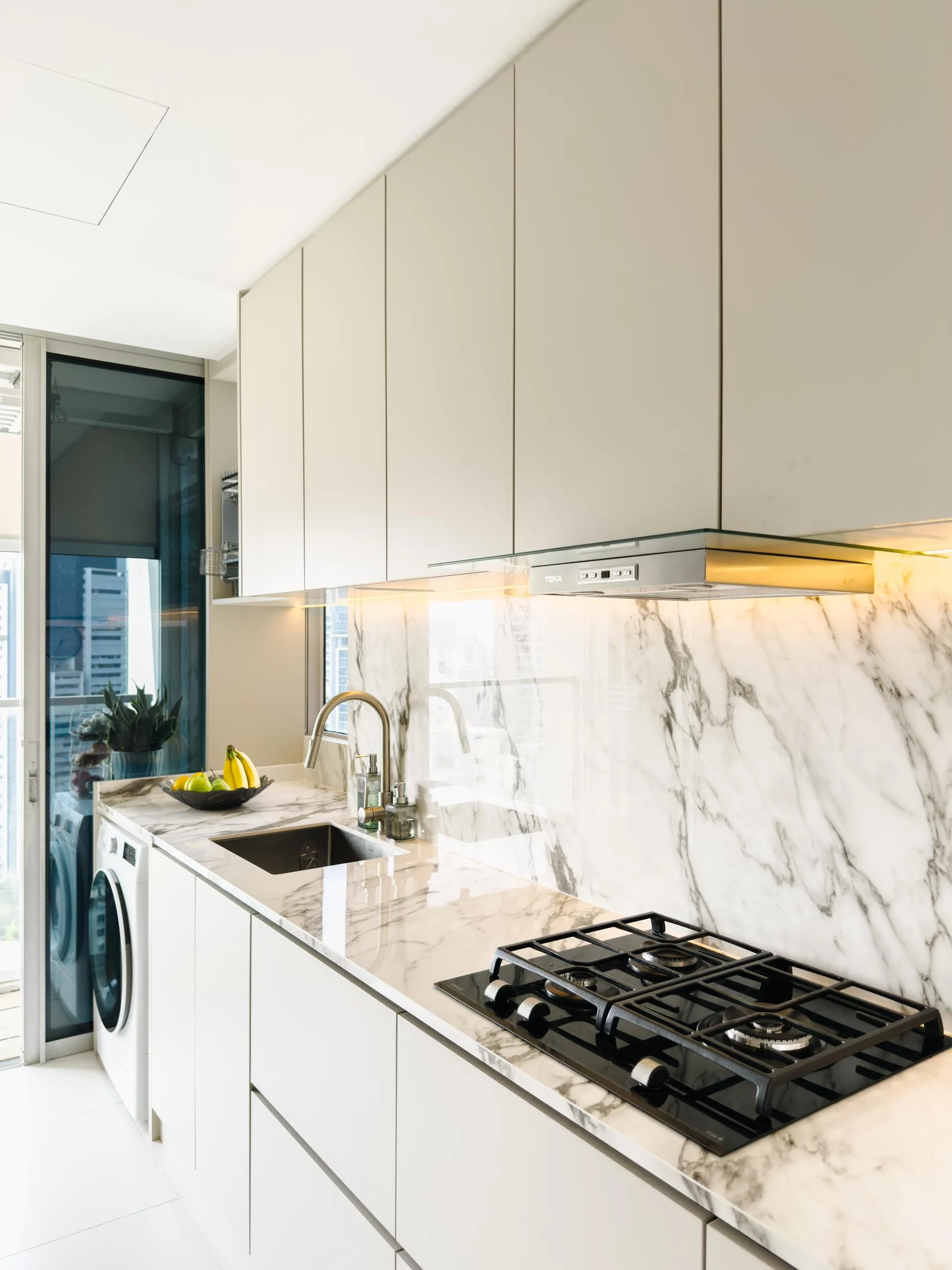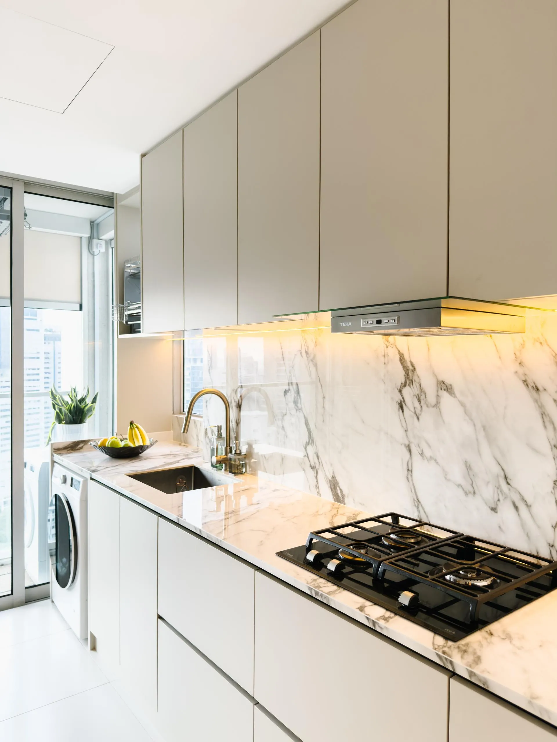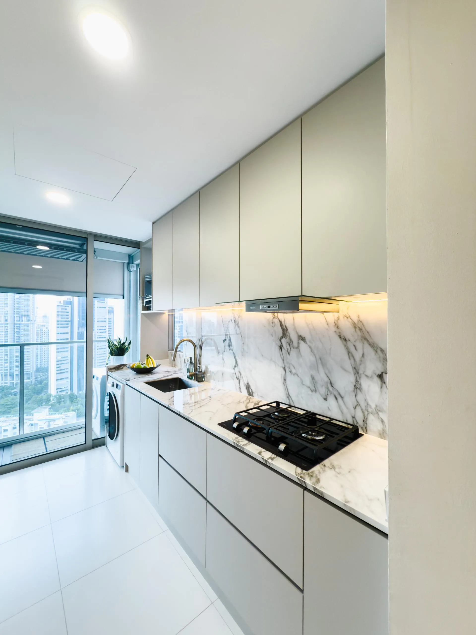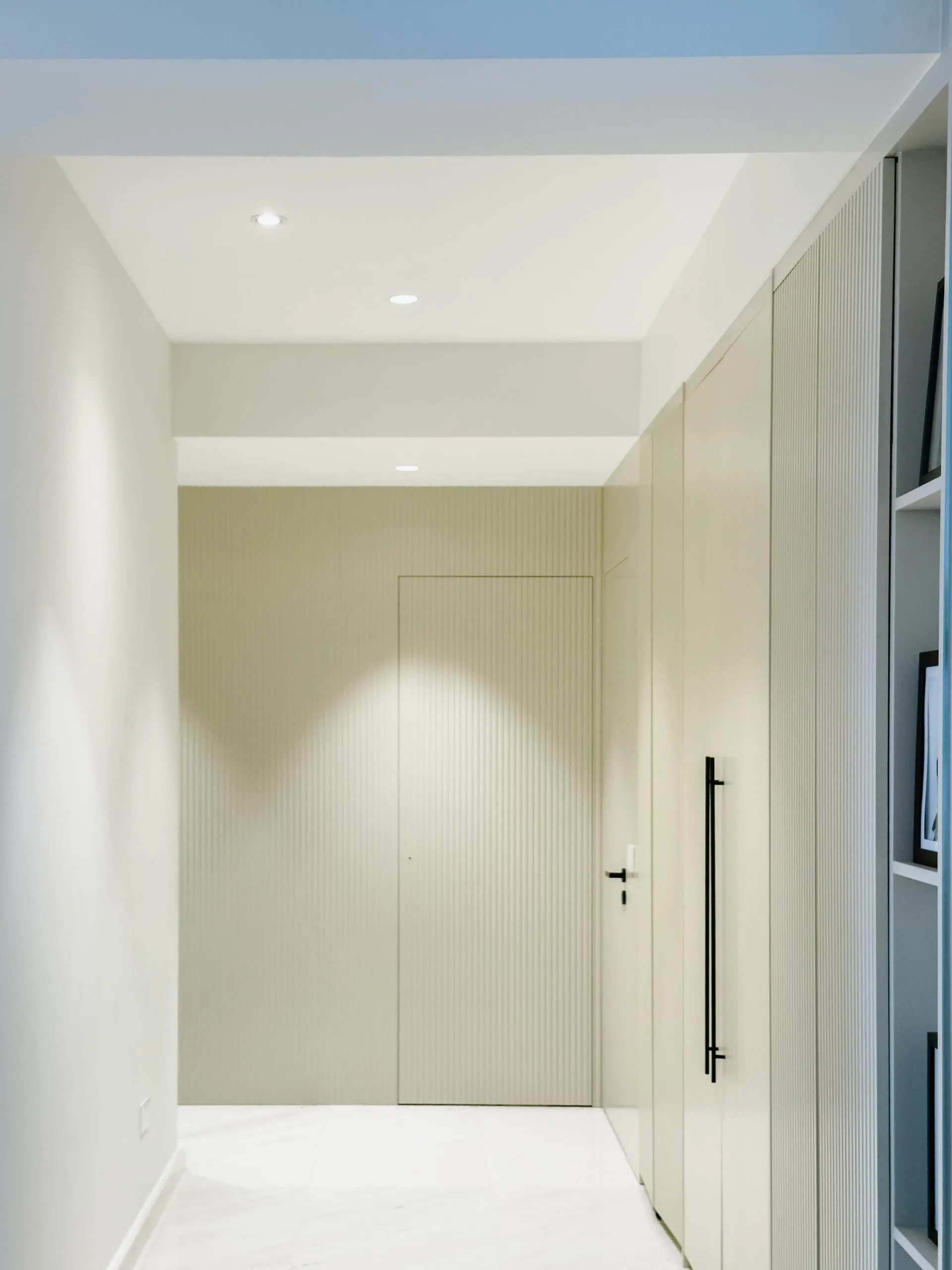 The design leans into soft minimalism, where architectural lines are clean, but never sterile. Fluted wall panels stretch across the hallway, visually elongating the space while concealing doorways with elegant subtlety. In the wet kitchen, matte laminate cabinetry in a soft beige tone blends seamlessly with the marble backsplash, creating a continuous, fluid visual language.