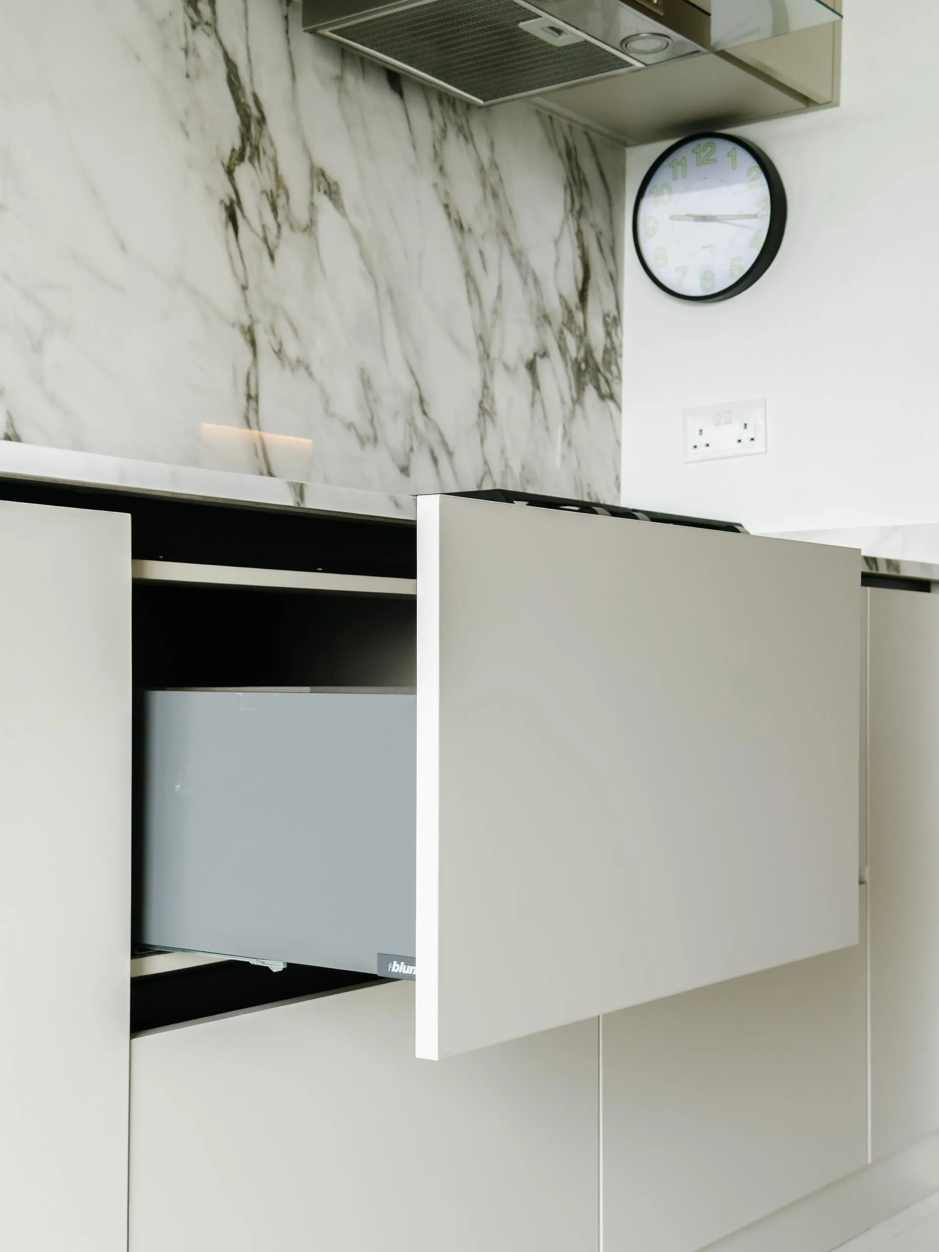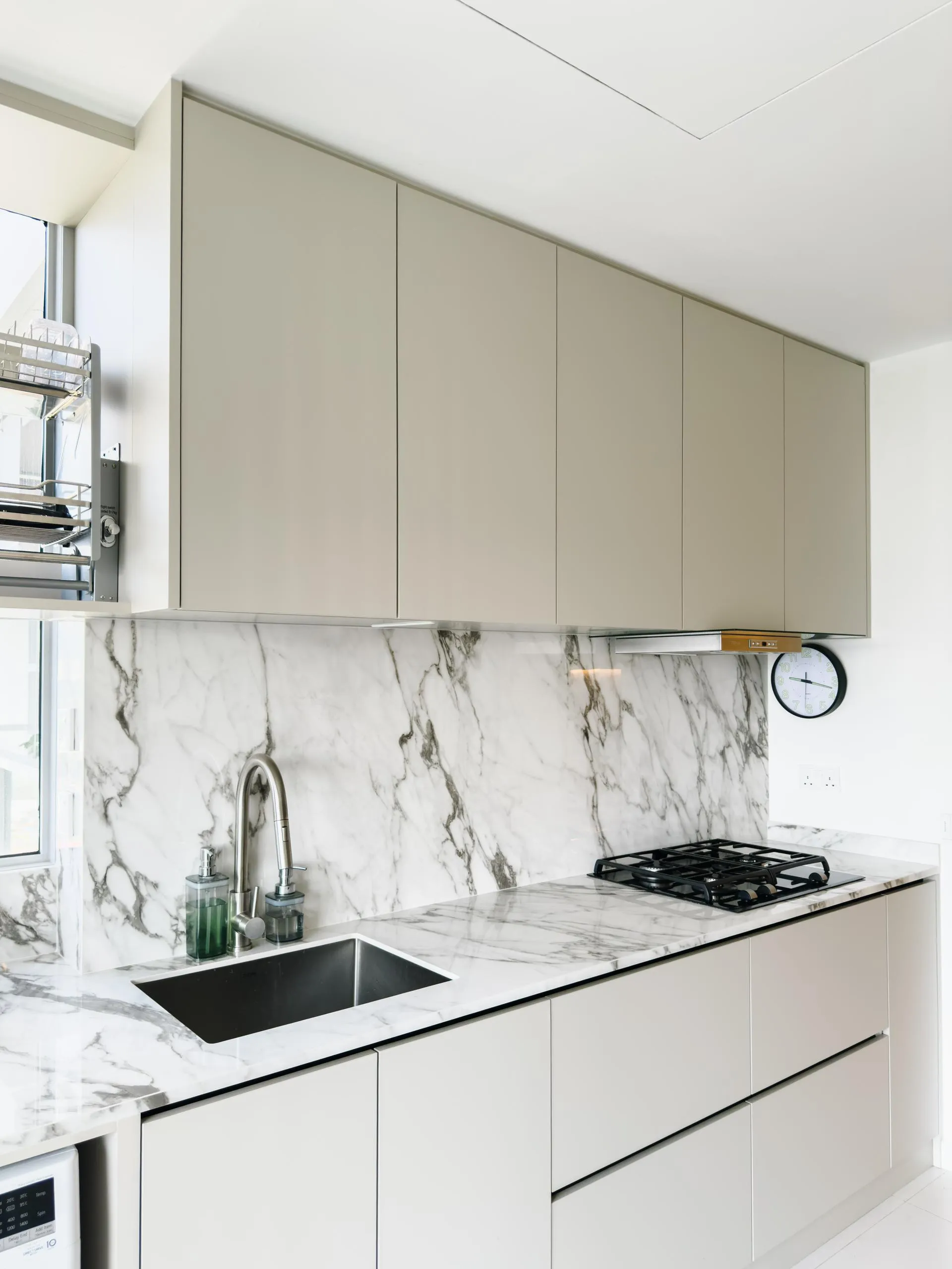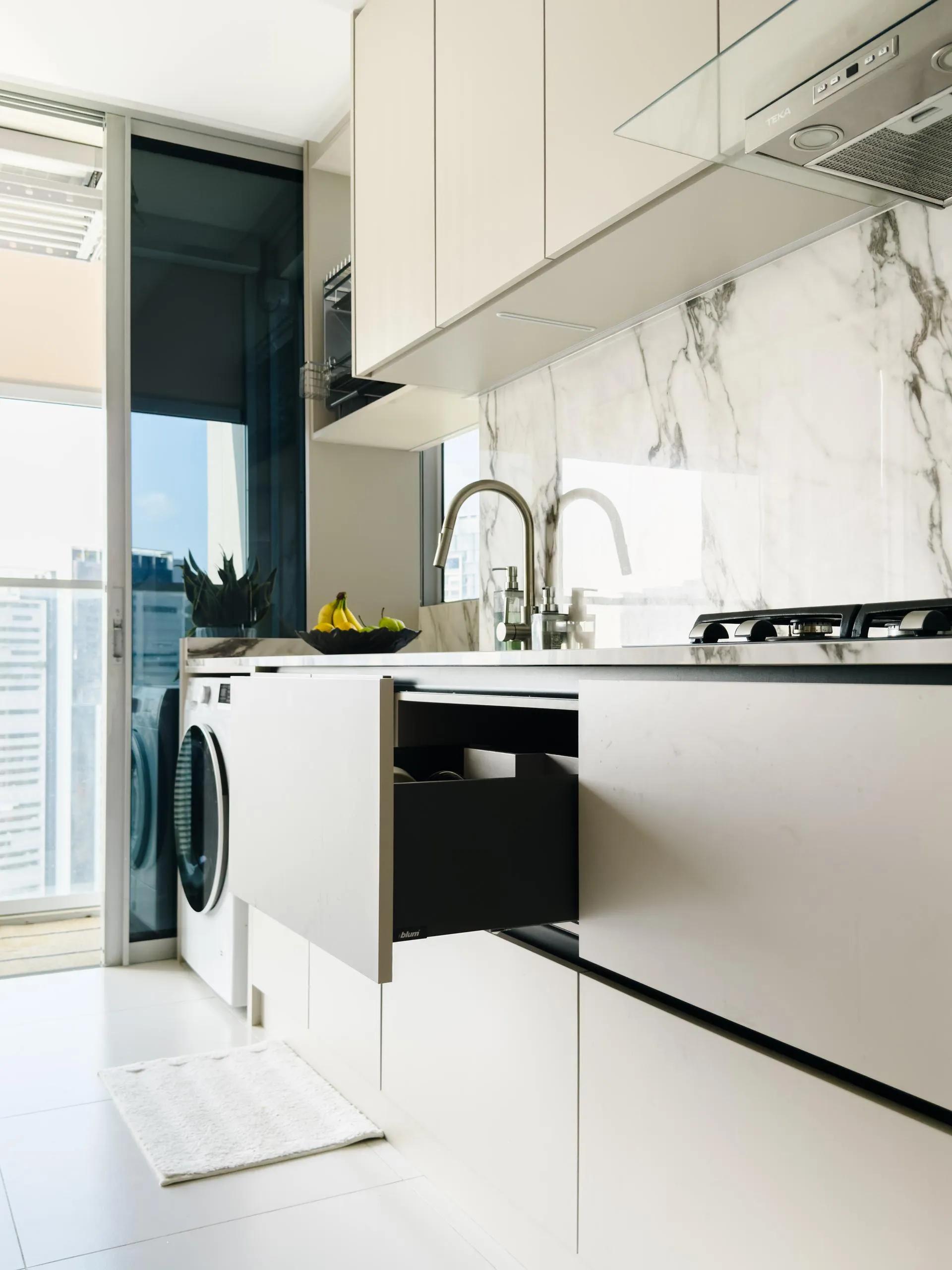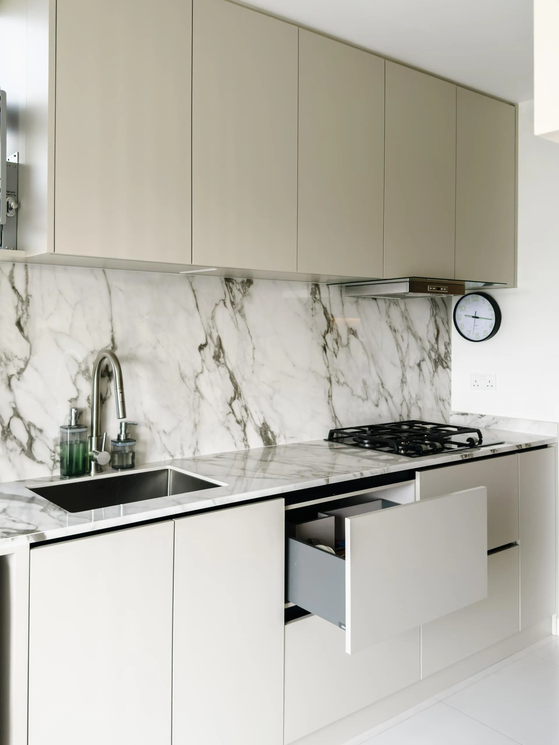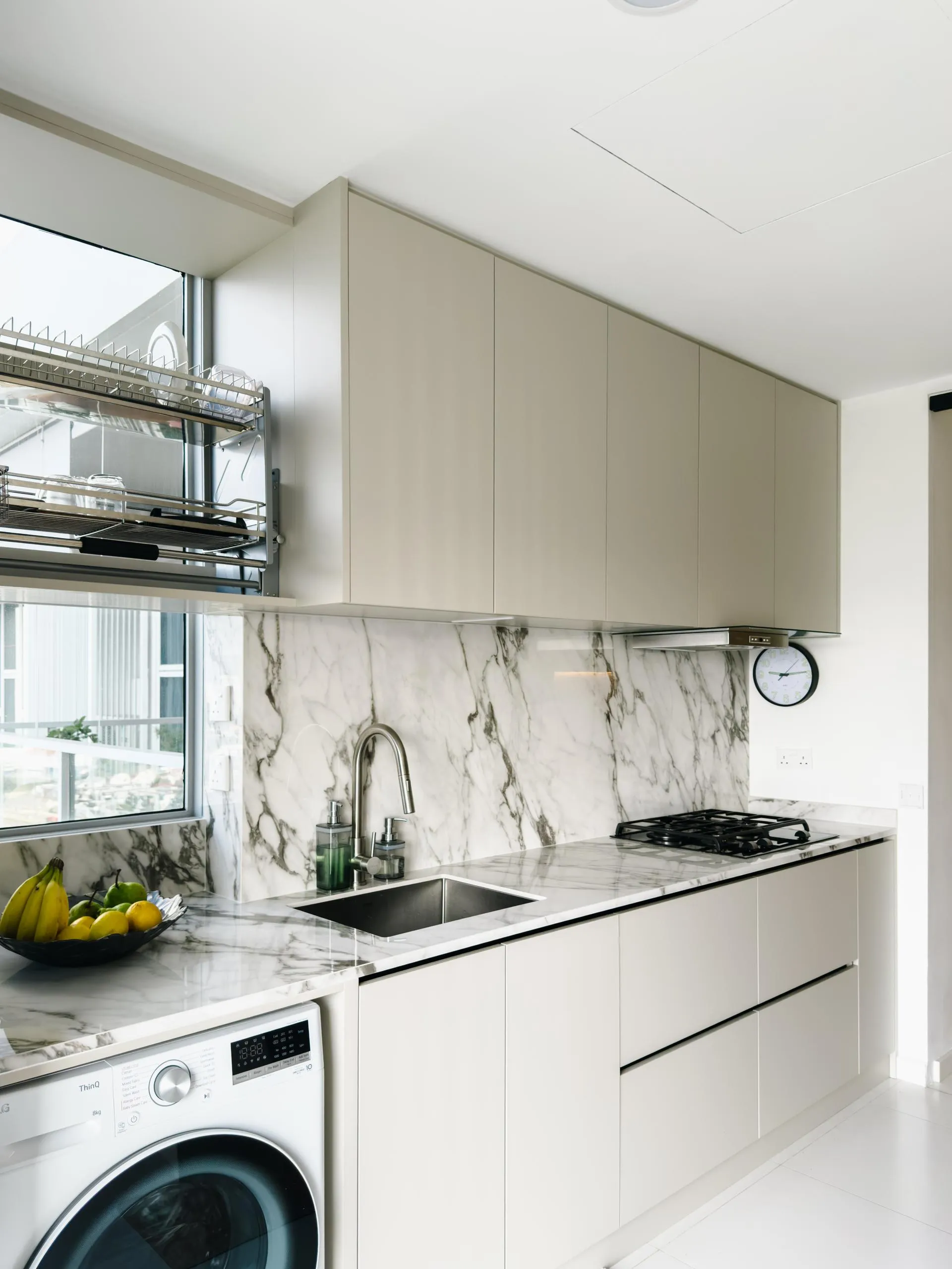 The design leans into soft minimalism, where architectural lines are clean, but never sterile. Fluted wall panels stretch across the hallway, visually elongating the space while concealing doorways with elegant subtlety. In the wet kitchen, matte laminate cabinetry in a soft beige tone blends seamlessly with the marble backsplash, creating a continuous, fluid visual language.