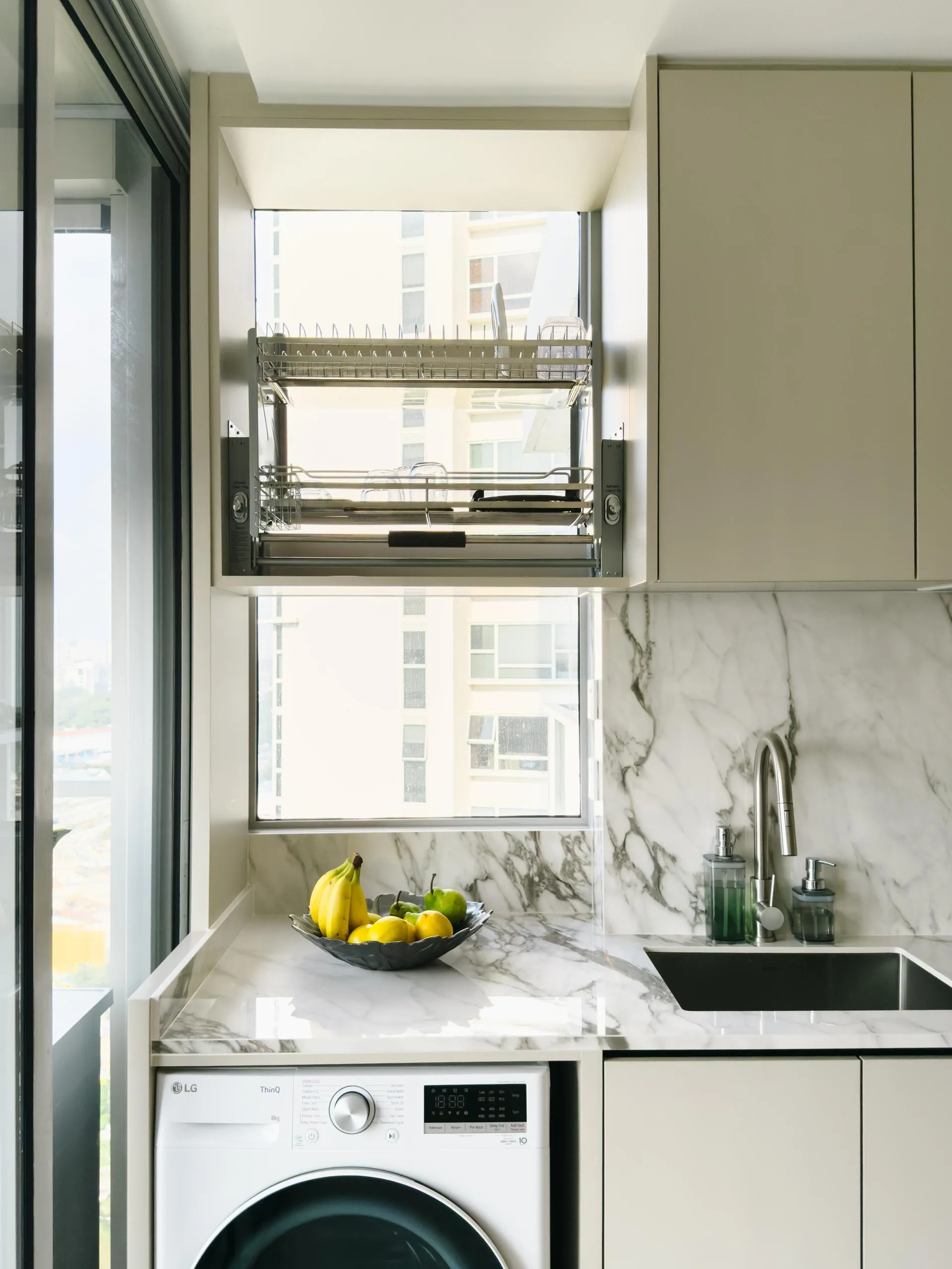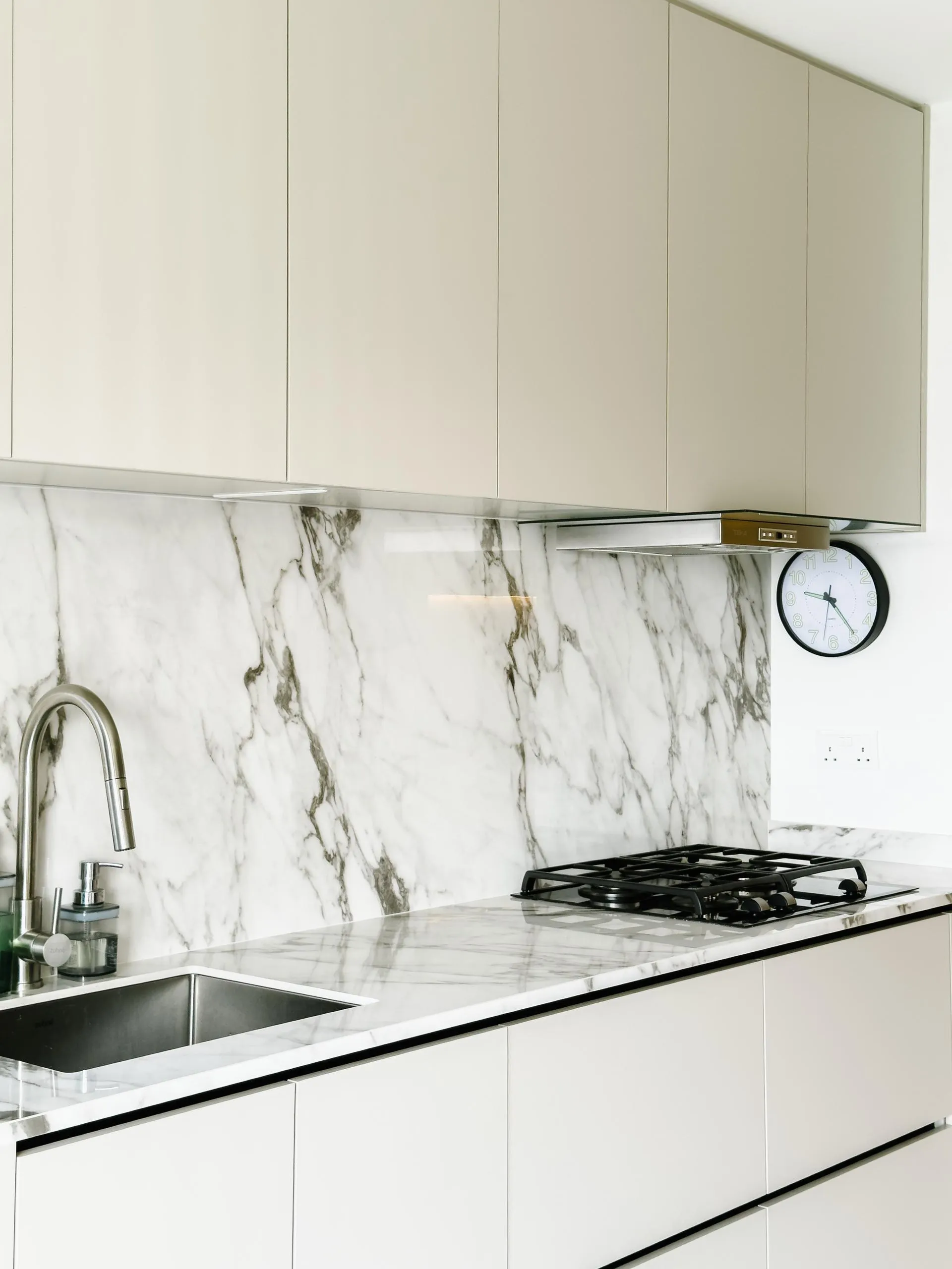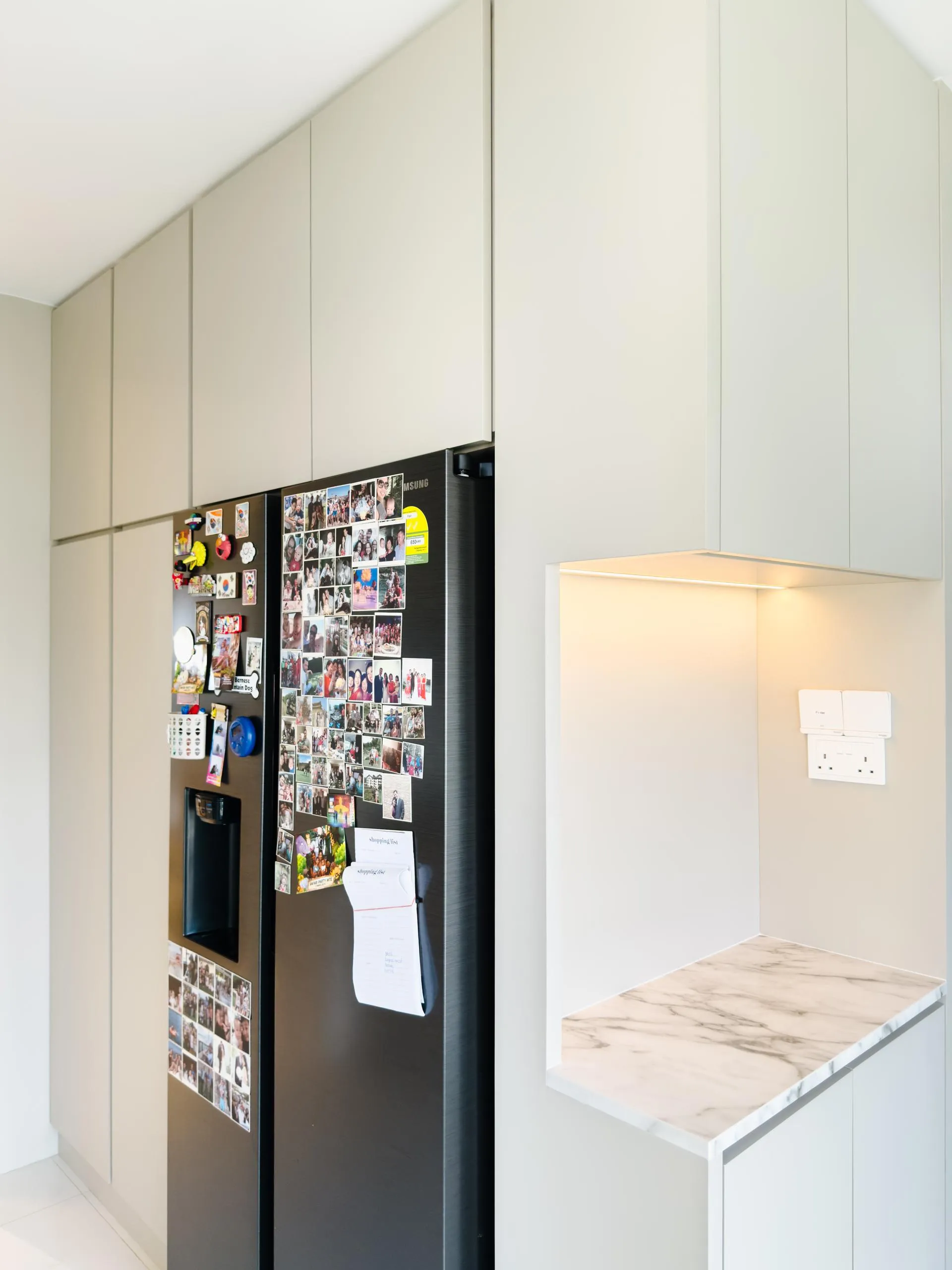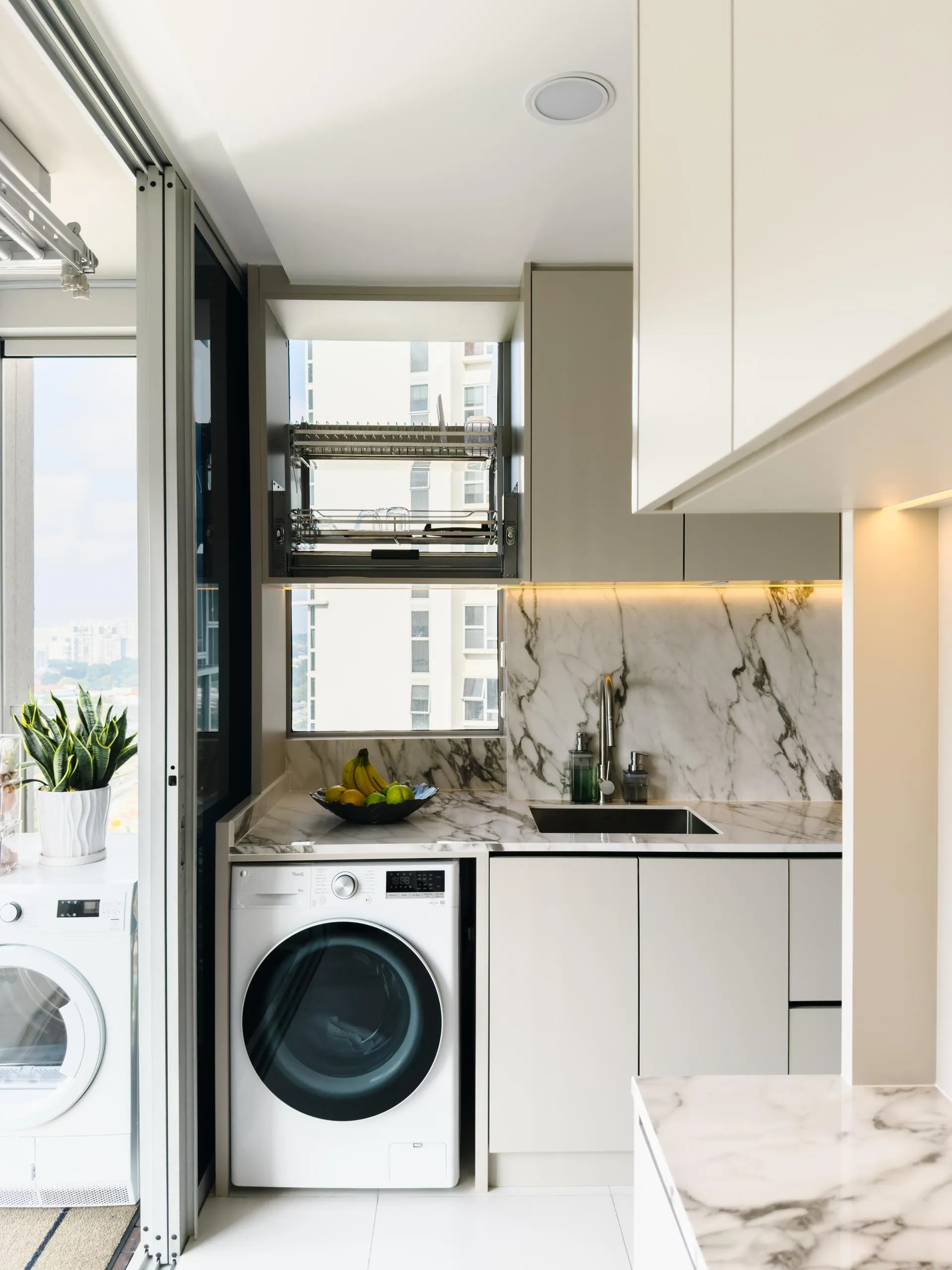 The design leans into soft minimalism, where architectural lines are clean, but never sterile. Fluted wall panels stretch across the hallway, visually elongating the space while concealing doorways with elegant subtlety. In the wet kitchen, matte laminate cabinetry in a soft beige tone blends seamlessly with the marble backsplash, creating a continuous, fluid visual language.