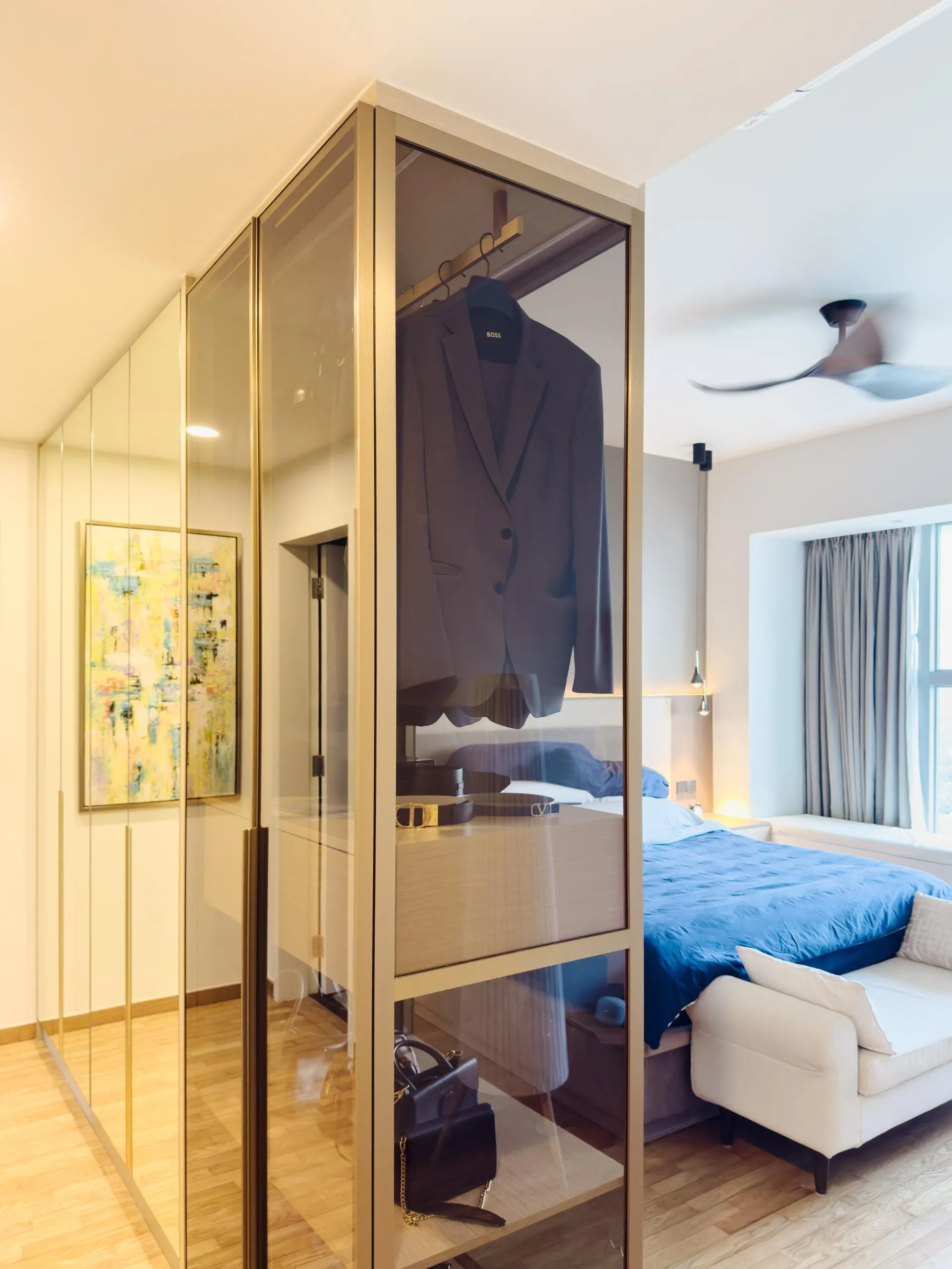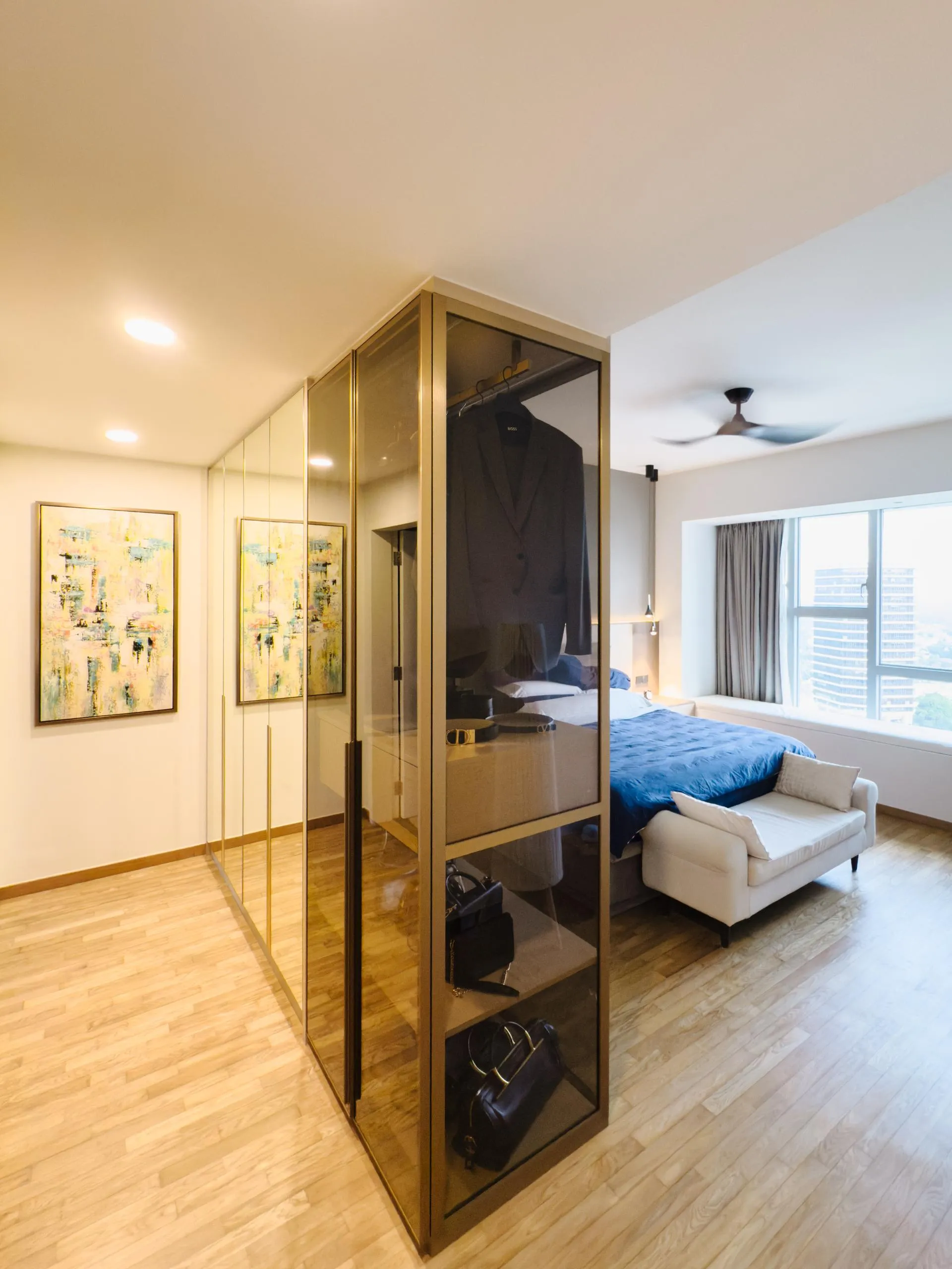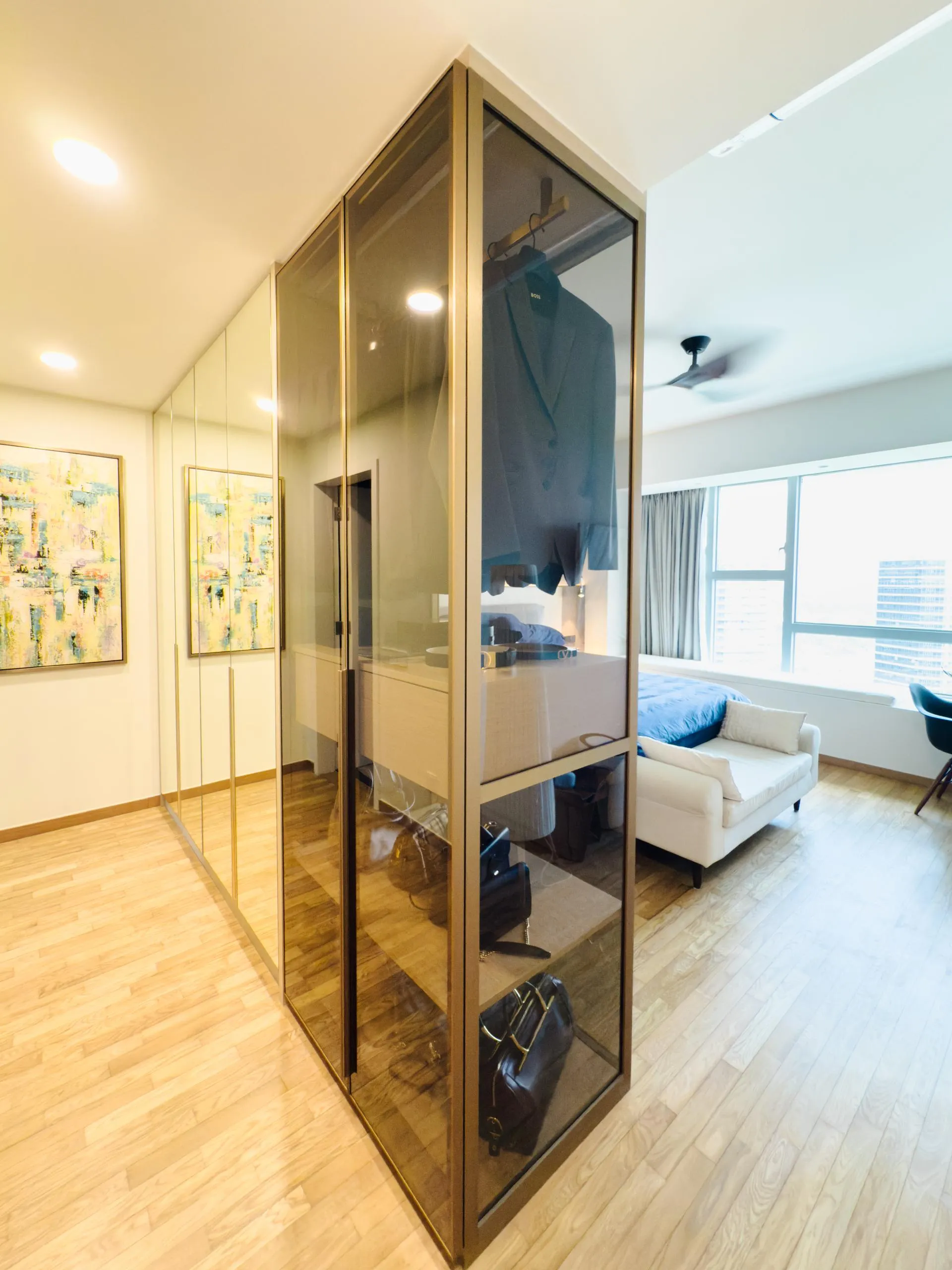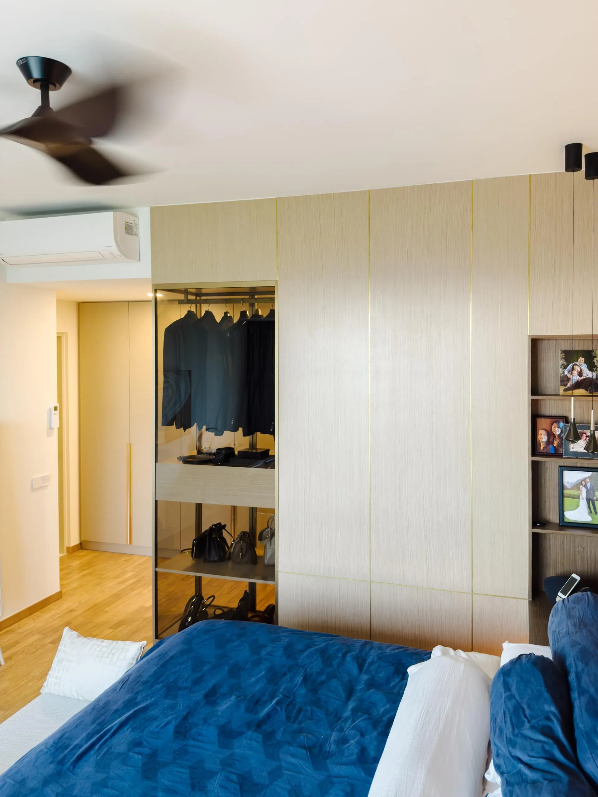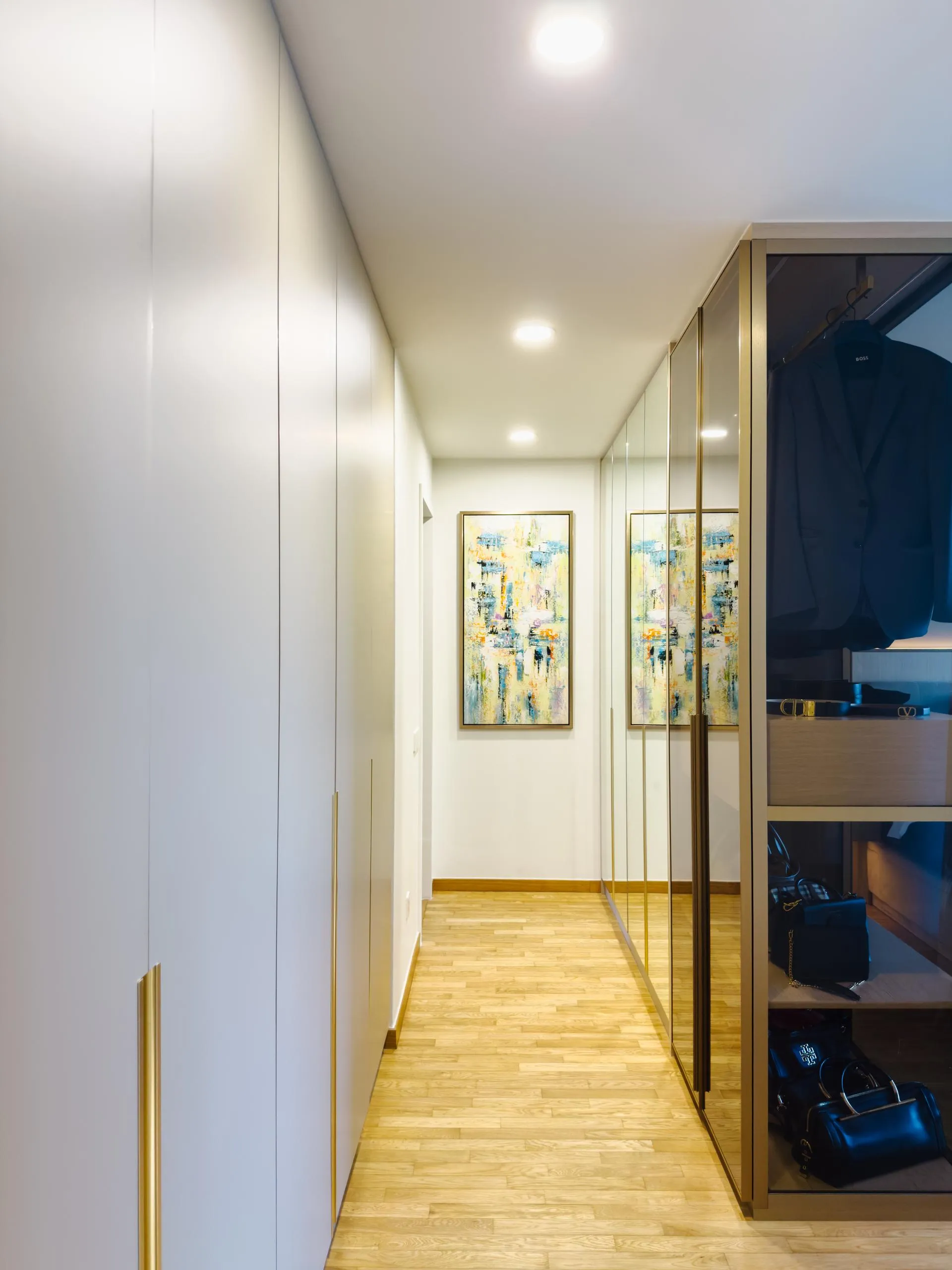 Materiality is restrained yet tactile — the use of high-quality laminates offers a muted sheen and warm neutrality, allowing natural light to bounce softly across surfaces. The result is a calm, considered environment with a heightened sense of spatial order — one that feels serene, lived-in, and visually coherent.