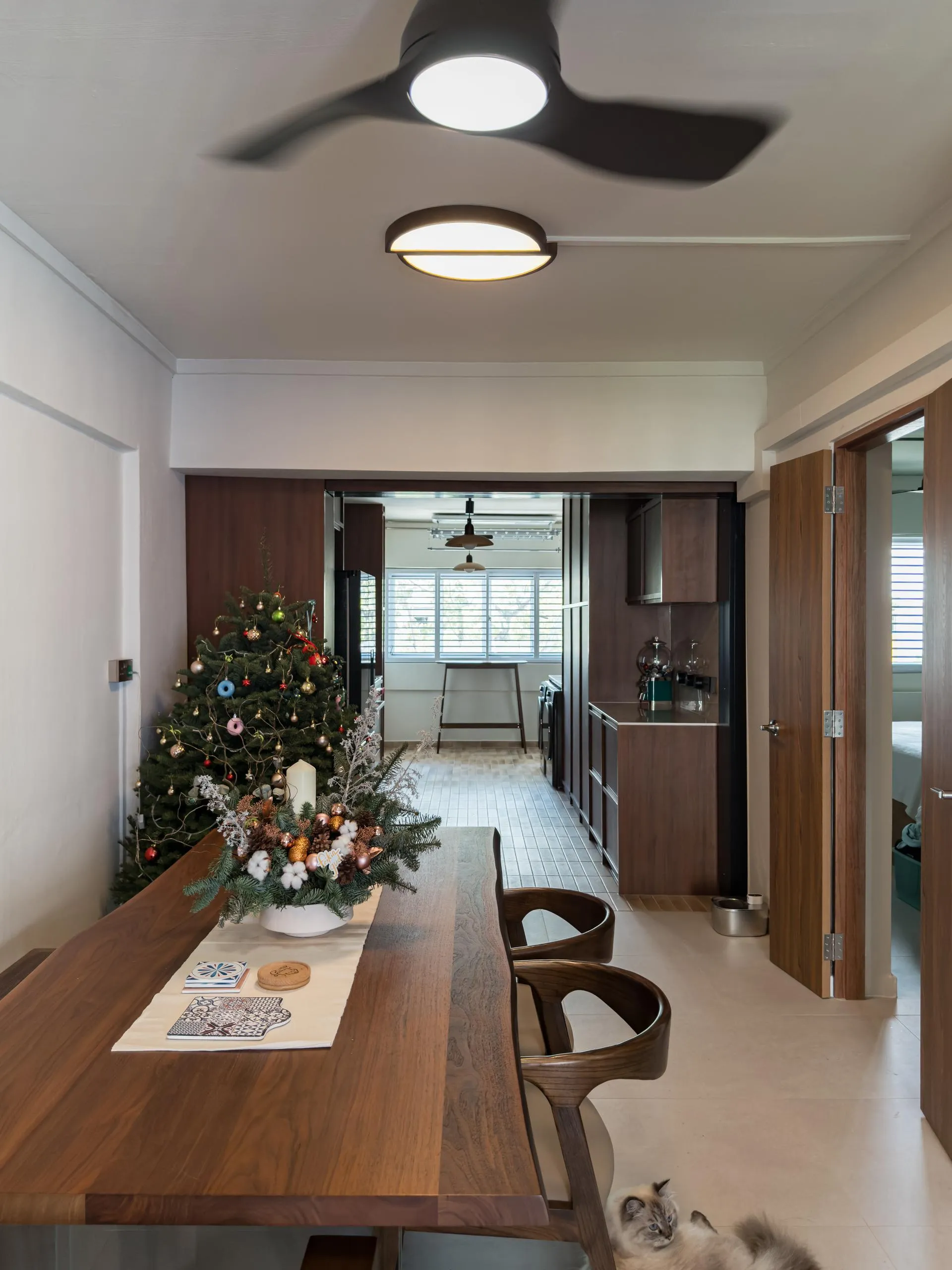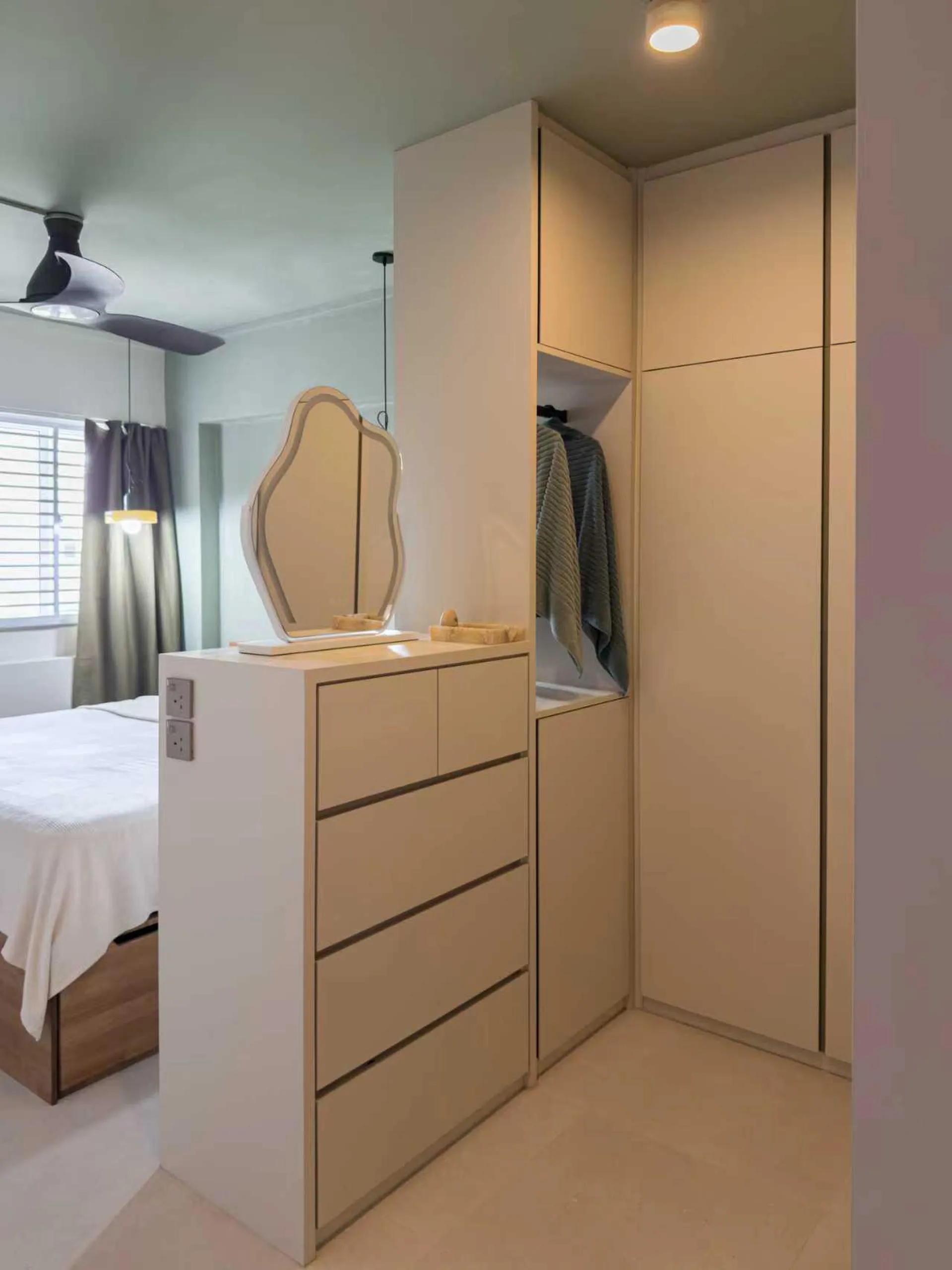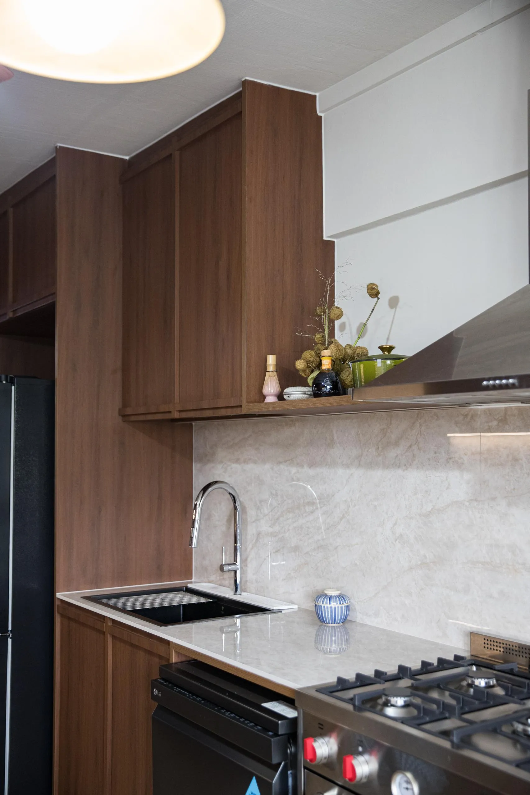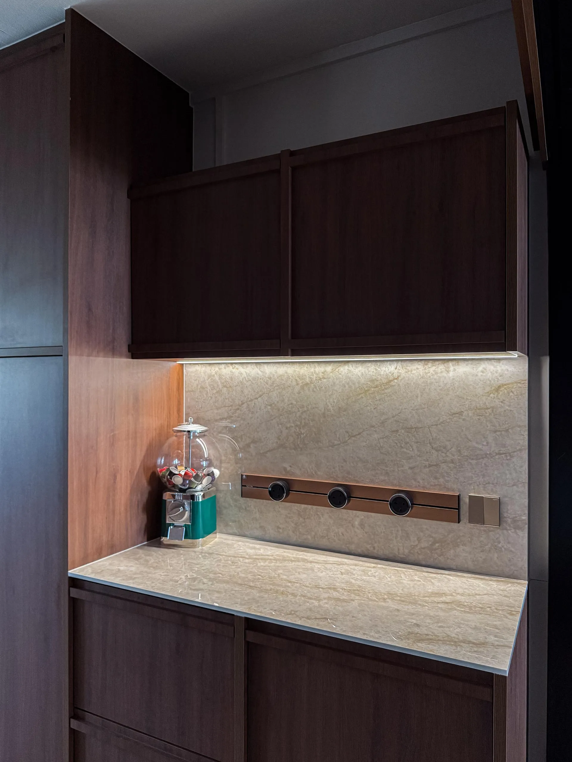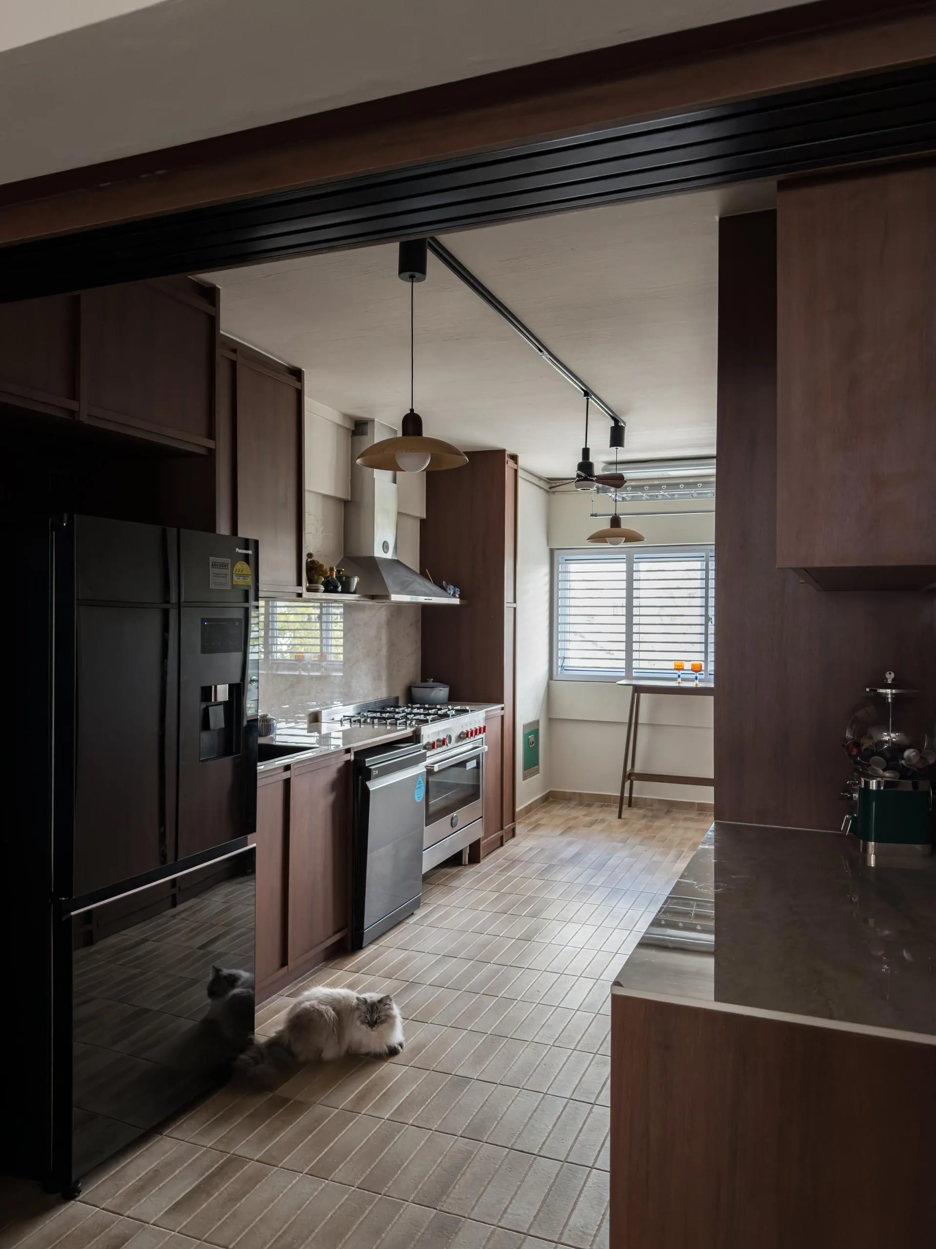 Warm woodgrain finishes anchor the kitchen, creating visual depth while maintaining a sleek, linear layout. Full-height cabinetry is precisely built to frame appliances and utilities, reinforcing a sense of order and continuity. The carpentry extends naturally into the private areas, where soft neutral laminates and flush-panel doors shape a tranquil bedroom environment. Subtle detailing, concealed storage, and well-proportioned forms allow the carpentry to complement the space without overpowering it.