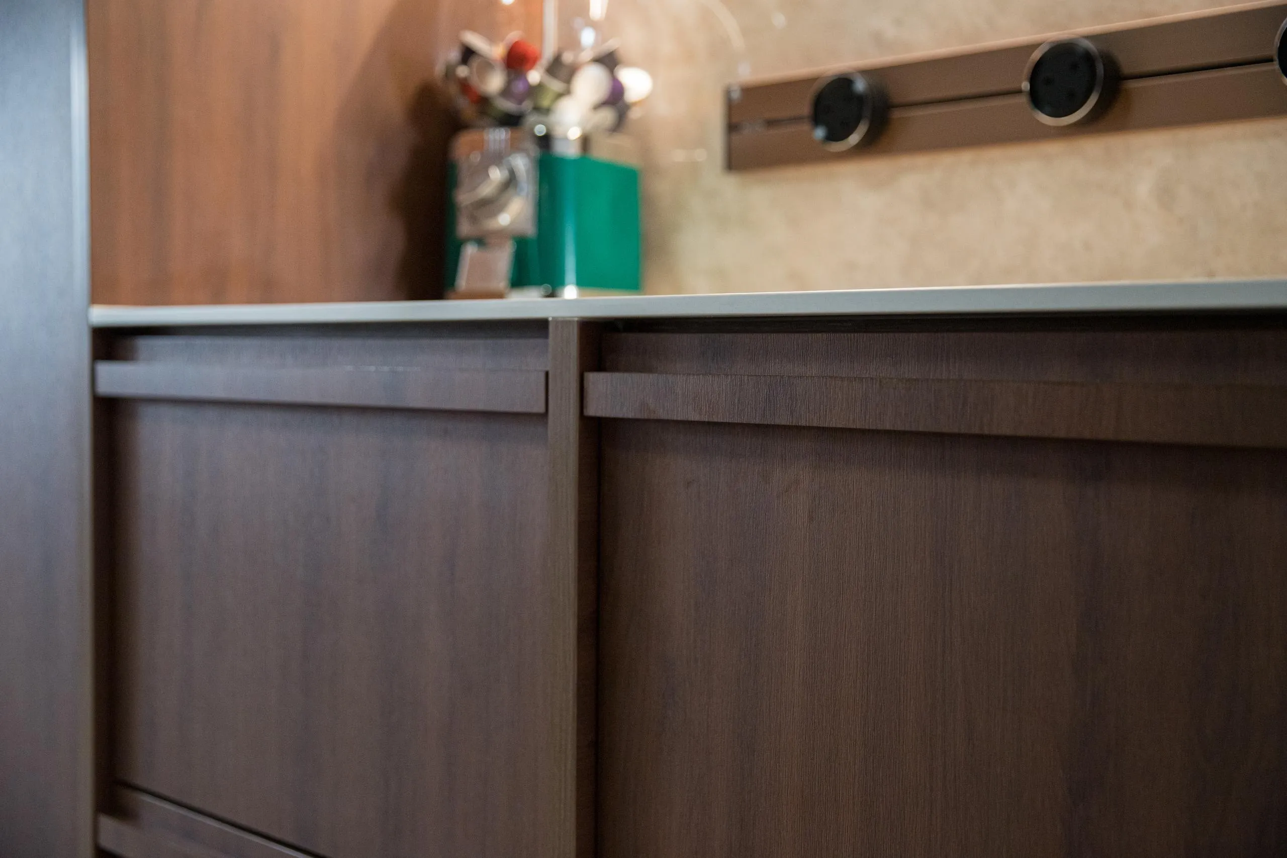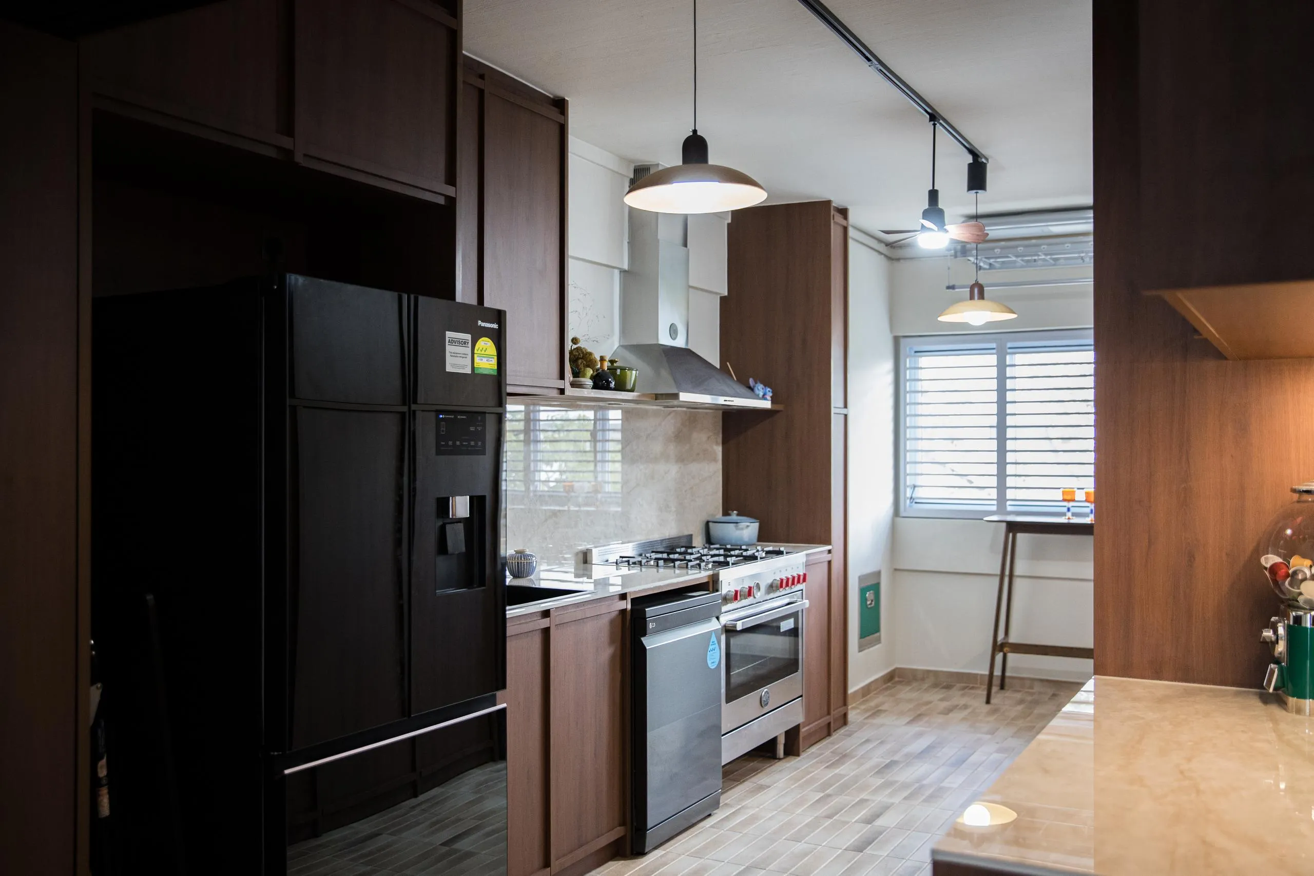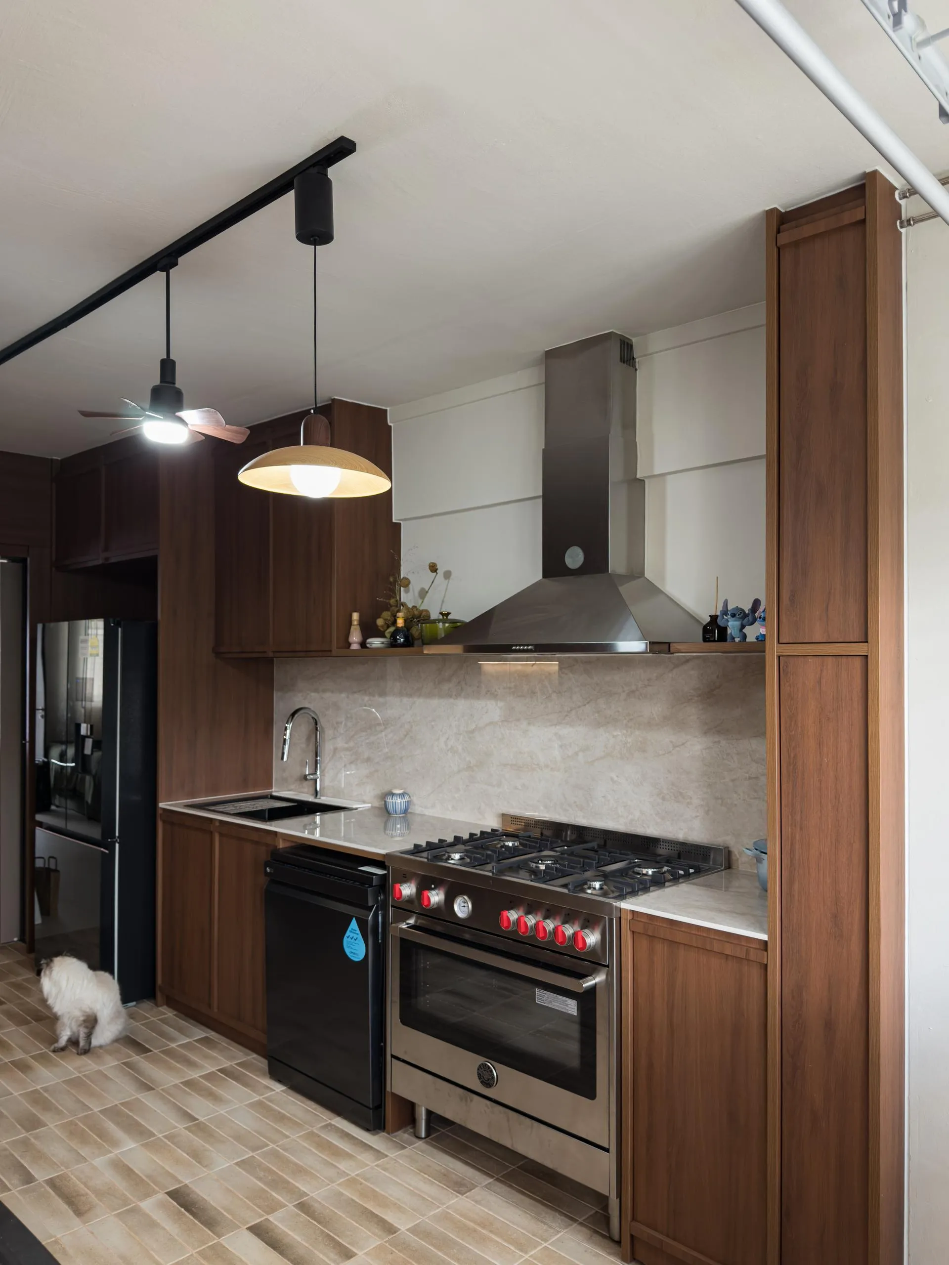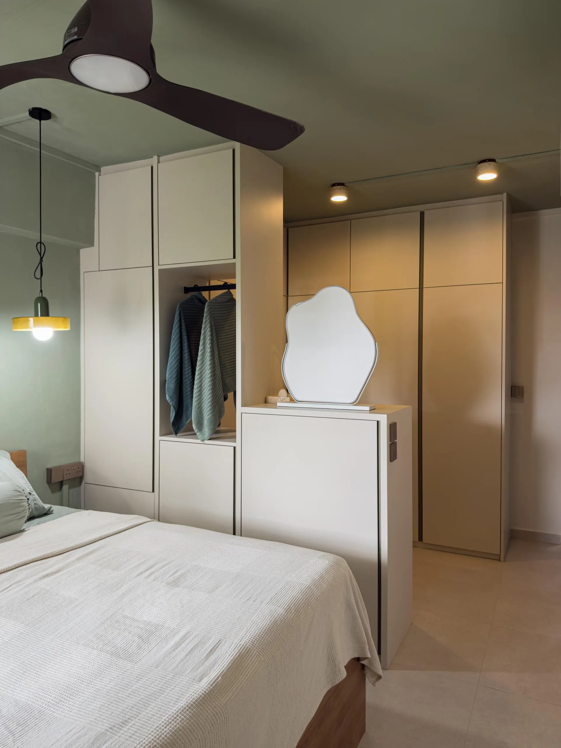 Warm woodgrain finishes anchor the kitchen, creating visual depth while maintaining a sleek, linear layout. Full-height cabinetry is precisely built to frame appliances and utilities, reinforcing a sense of order and continuity. The carpentry extends naturally into the private areas, where soft neutral laminates and flush-panel doors shape a tranquil bedroom environment. Subtle detailing, concealed storage, and well-proportioned forms allow the carpentry to complement the space without overpowering it.