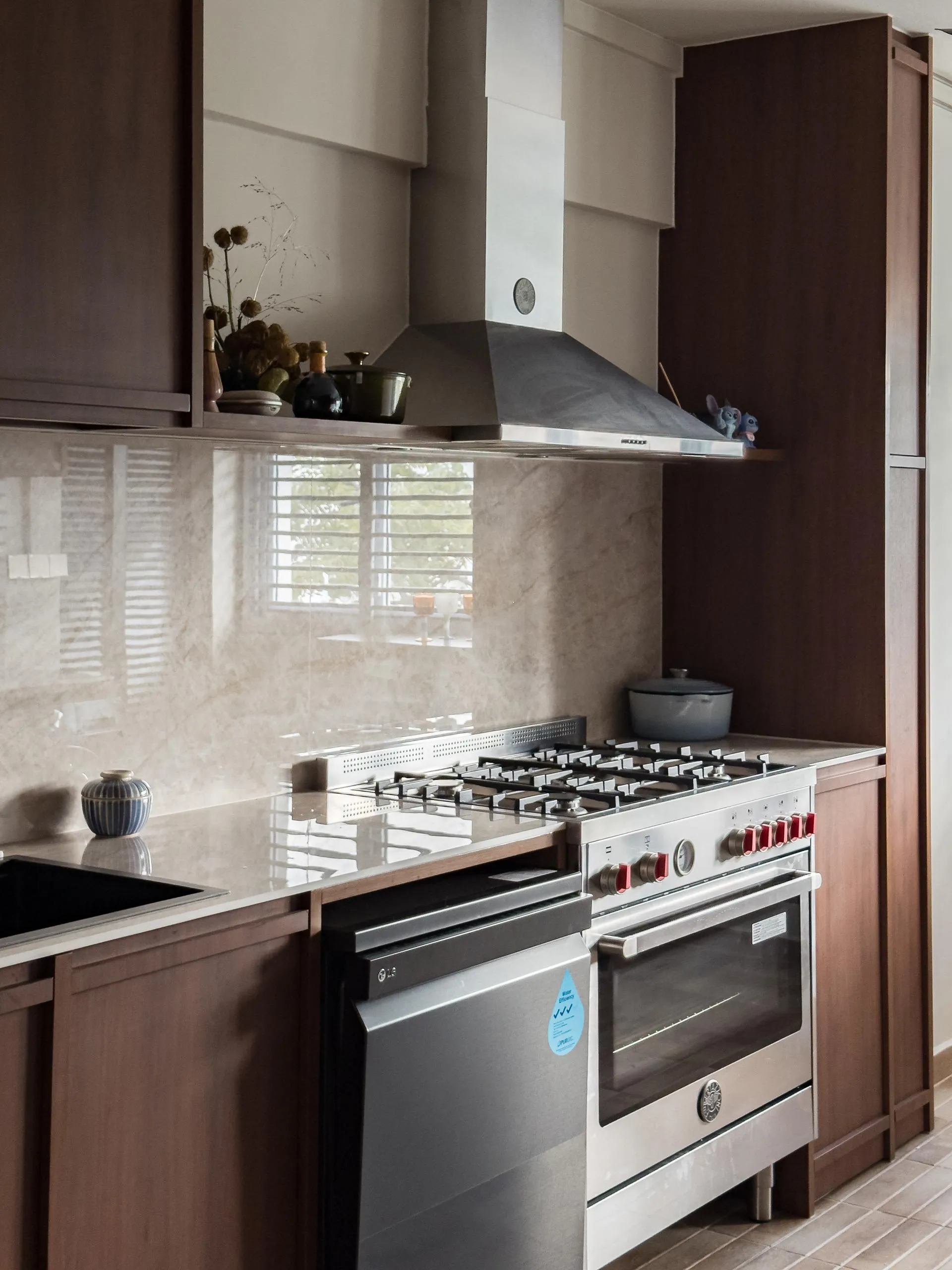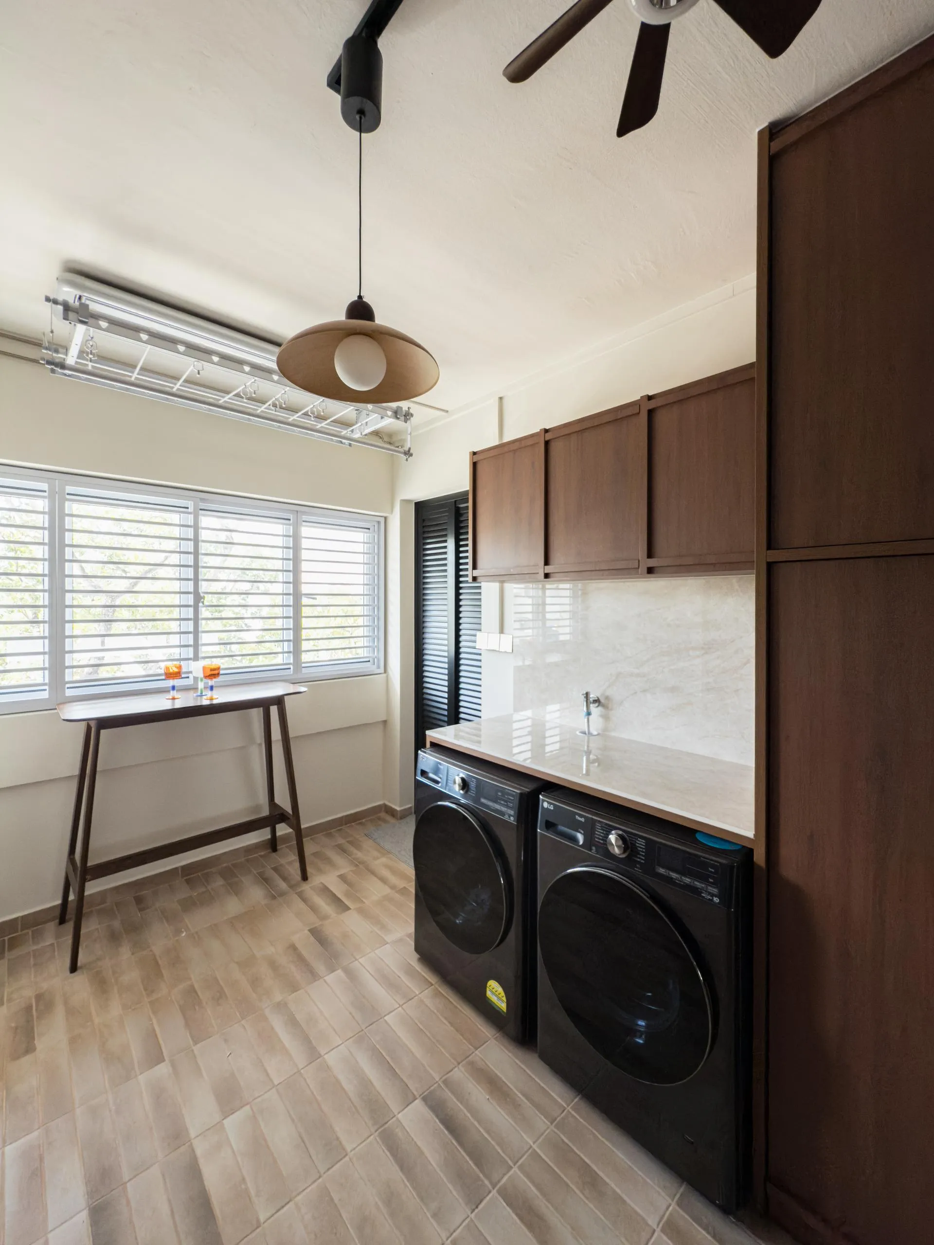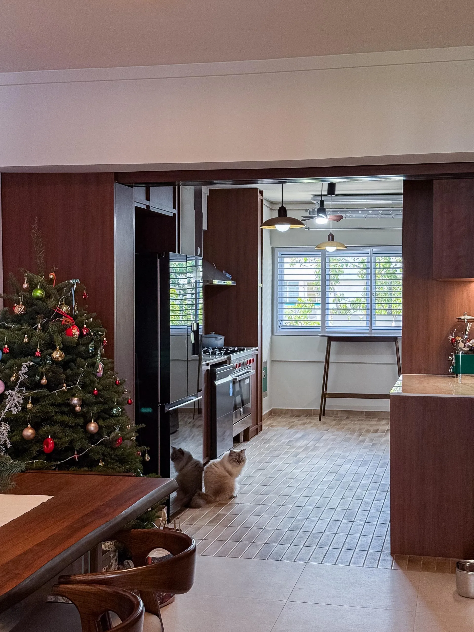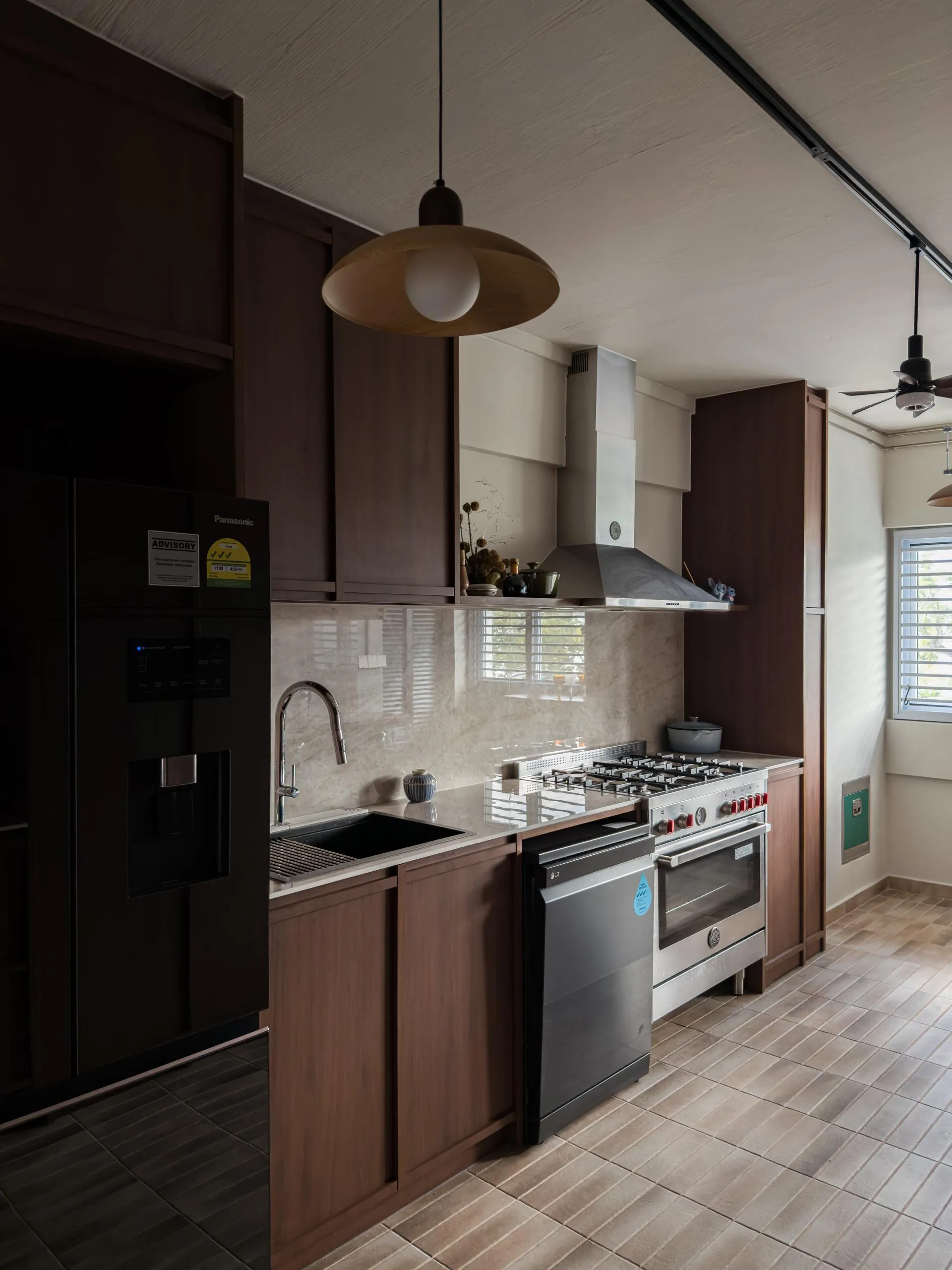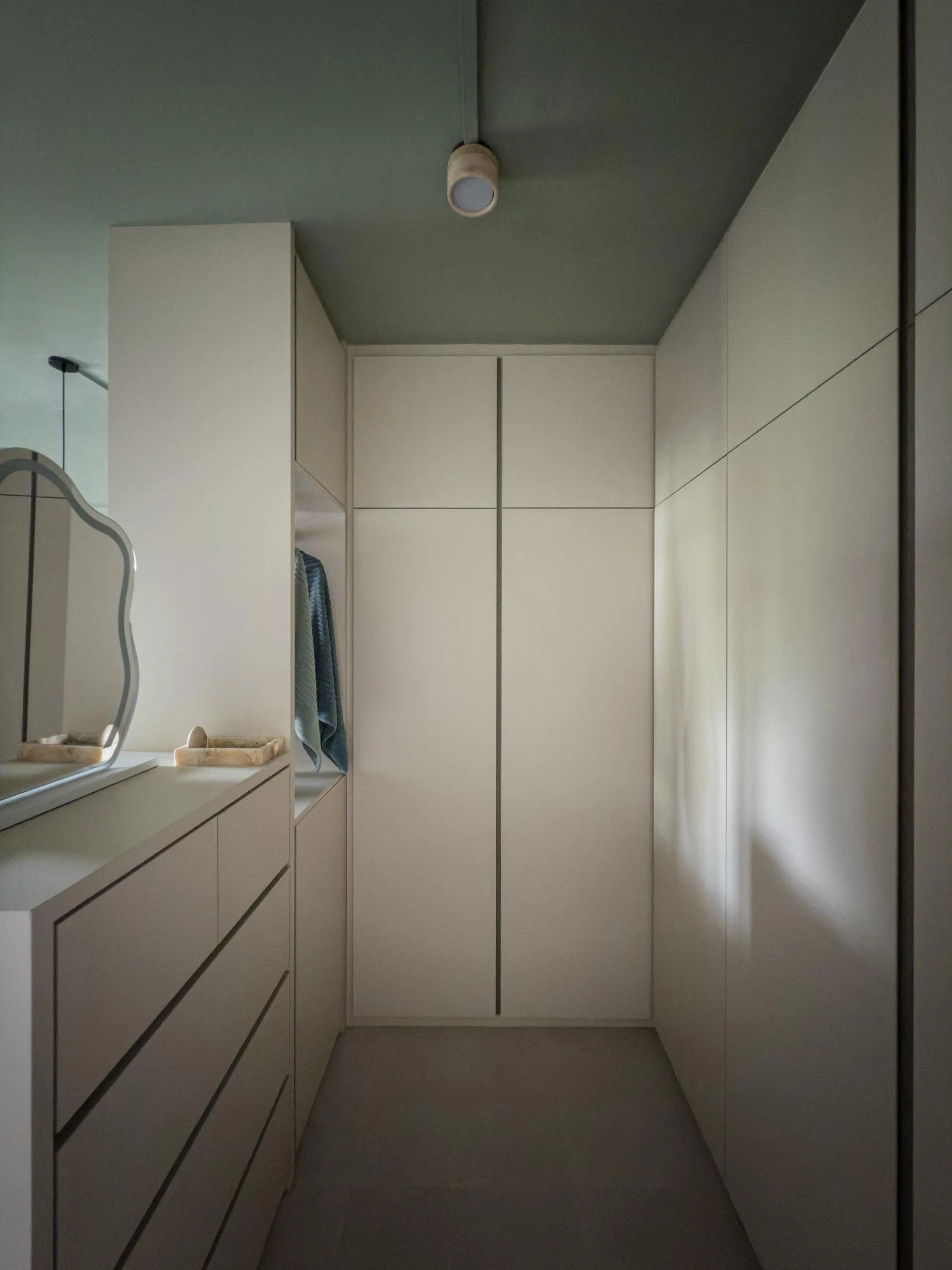 Warm woodgrain finishes anchor the kitchen, creating visual depth while maintaining a sleek, linear layout. Full-height cabinetry is precisely built to frame appliances and utilities, reinforcing a sense of order and continuity. The carpentry extends naturally into the private areas, where soft neutral laminates and flush-panel doors shape a tranquil bedroom environment. Subtle detailing, concealed storage, and well-proportioned forms allow the carpentry to complement the space without overpowering it.